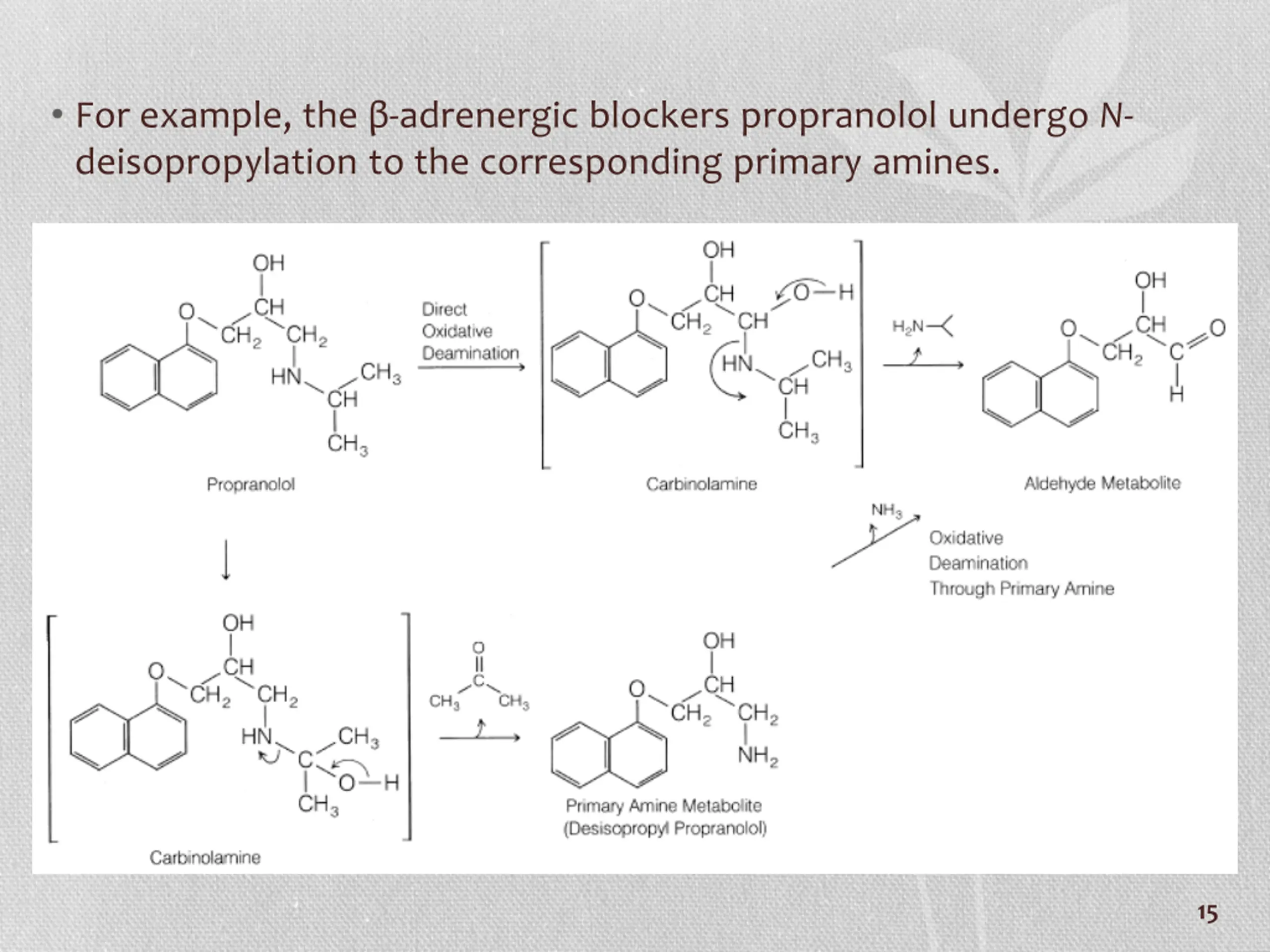 For example, the -adrenergic blockers propranolol undergo N- deisopropylation to the corresponding primary amines. 15