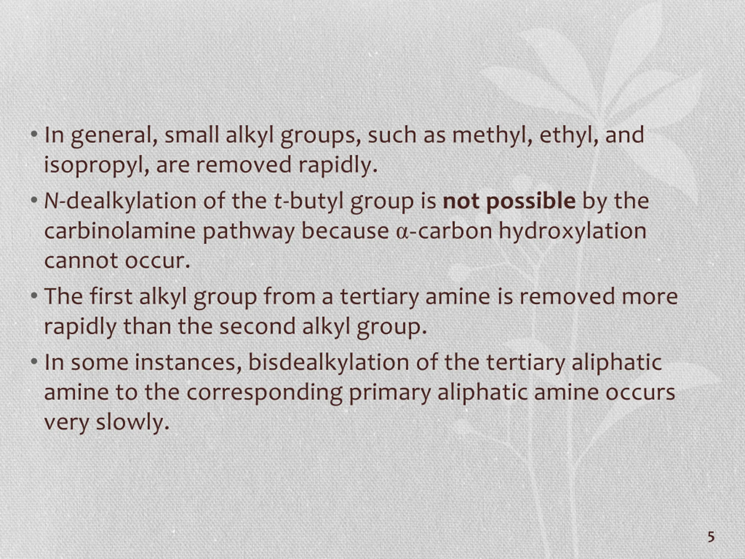 In general, small alkyl groups, such as methyl, ethyl, and isopropyl, are removed rapidly. N-dealkylation of the t-butyl group is not possible by the carbinolamine pathway because -carbon hydroxylation cannot occur. The first alkyl group from a tertiary amine is removed more rapidly than the second alkyl group. In some instances, bisdealkylation of the tertiary aliphatic amine to the corresponding primary aliphatic amine occurs very slowly. 5