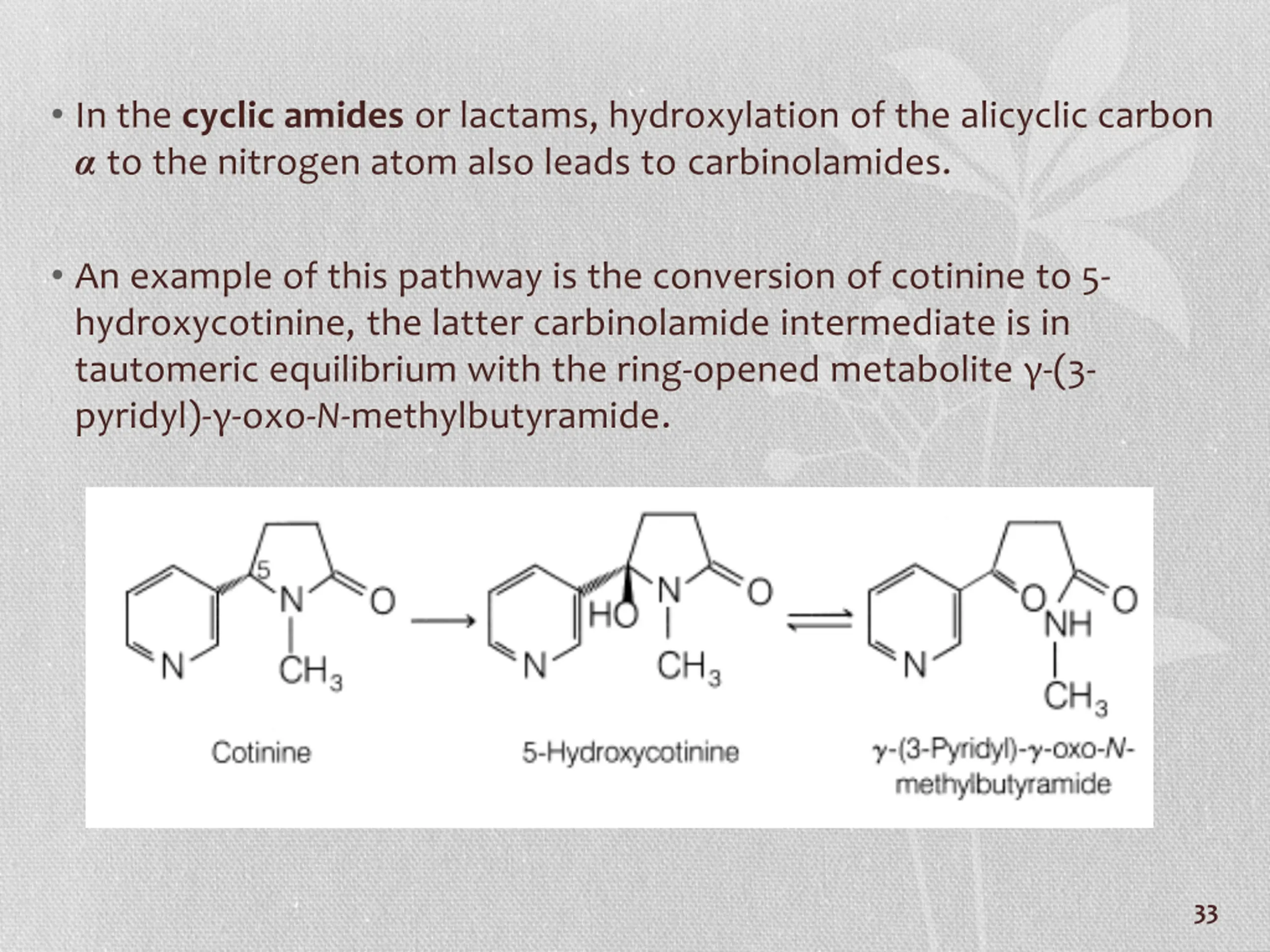 In the cyclic amides or lactams, hydroxylation of the alicyclic carbon to the nitrogen atom also leads to carbinolamides. An example of this pathway is the conversion of cotinine to 5- hydroxycotinine, the latter carbinolamide intermediate is in tautomeric equilibrium with the ring-opened metabolite -(3- pyridyl)- -oxo-N-methylbutyramide. 33