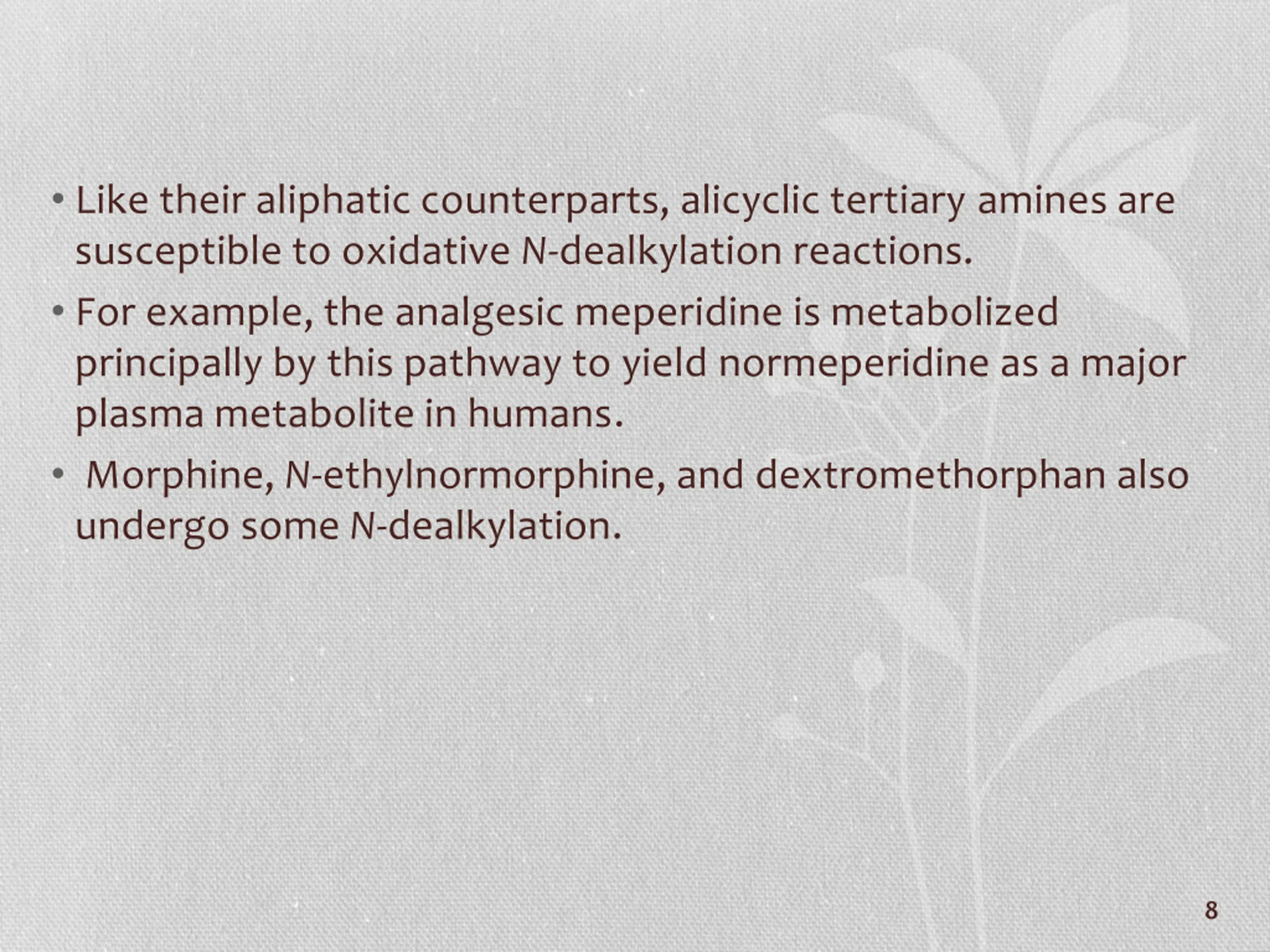 Like their aliphatic counterparts, alicyclic tertiary amines are susceptible to oxidative N-dealkylation reactions. For example, the analgesic meperidine is metabolized principally by this pathway to yield normeperidine as a major plasma metabolite in humans. Morphine, N-ethylnormorphine, and dextromethorphan also undergo some N-dealkylation. 8