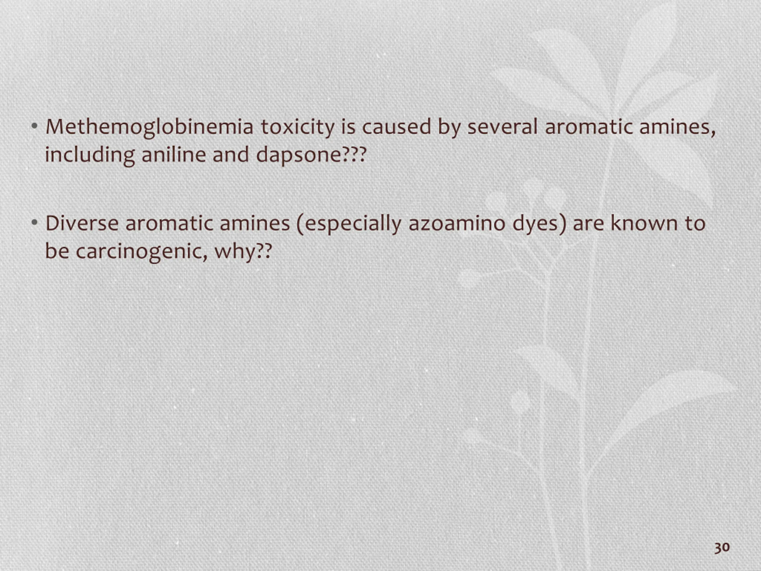 Methemoglobinemia toxicity is caused by several aromatic amines, including aniline and dapsone??? Diverse aromatic amines (especially azoamino dyes) are known to be carcinogenic, why?? 30