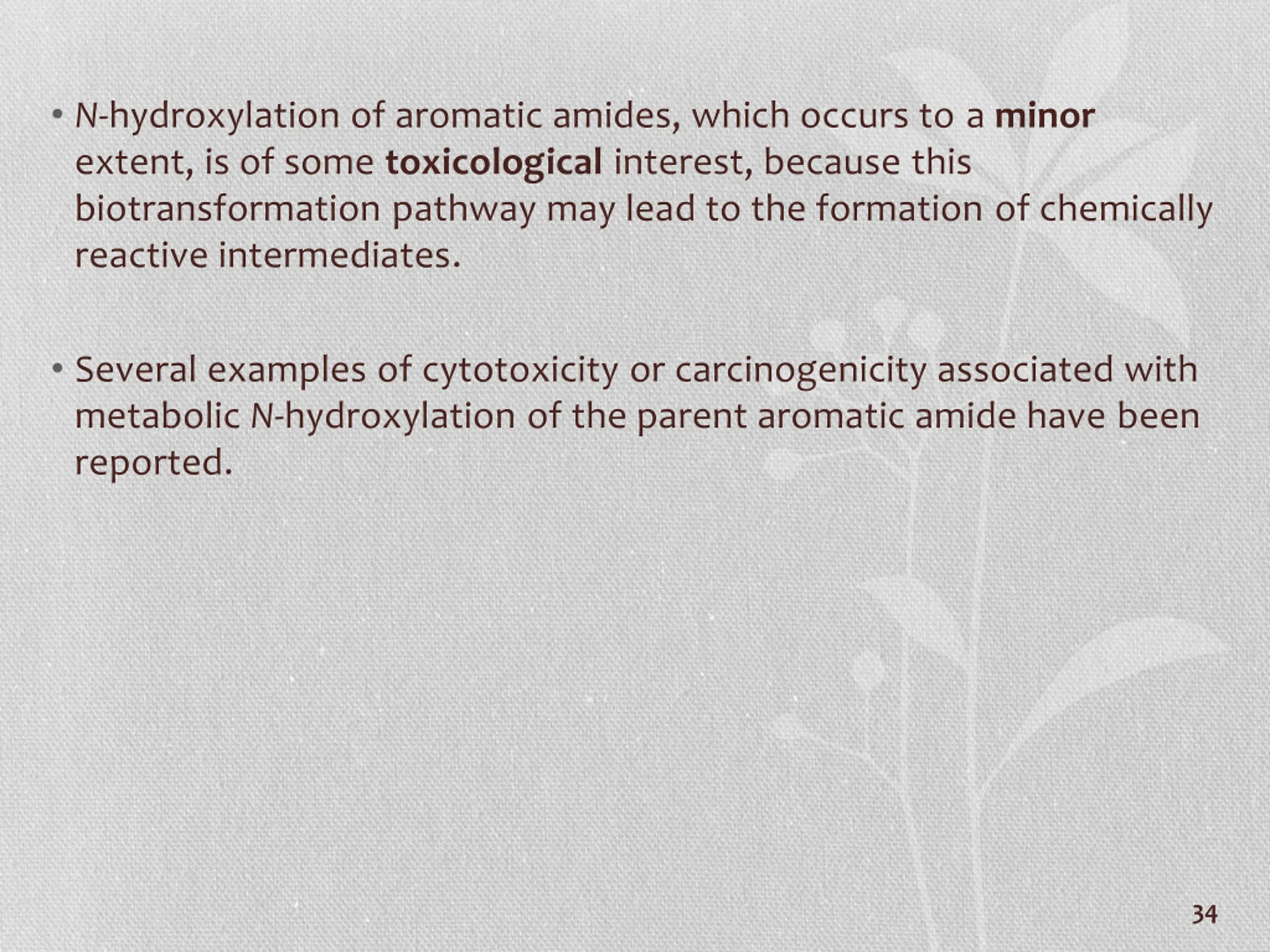 N-hydroxylation of aromatic amides, which occurs to a minor extent, is of some toxicological interest, because this biotransformation pathway may lead to the formation of chemically reactive intermediates. Several examples of cytotoxicity or carcinogenicity associated with metabolic N-hydroxylation of the parent aromatic amide have been reported. 34