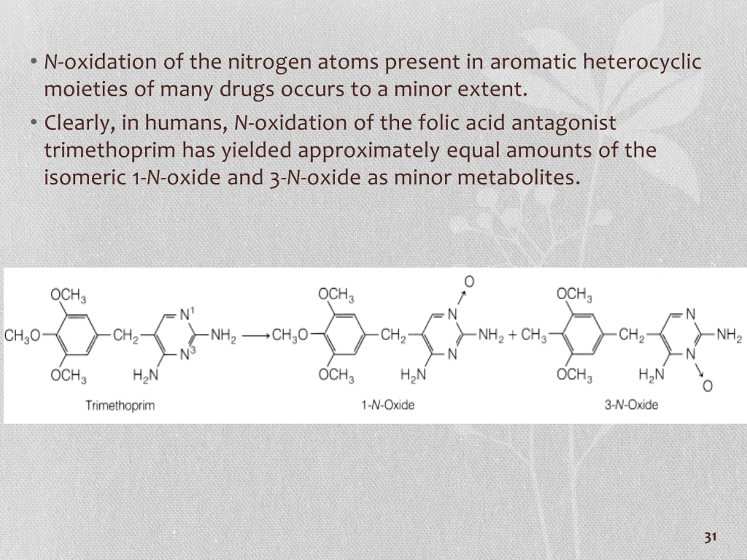 N-oxidation of the nitrogen atoms present in aromatic heterocyclic moieties of many drugs occurs to a minor extent. Clearly, in humans, N-oxidation of the folic acid antagonist trimethoprim has yielded approximately equal amounts of the isomeric 1-N-oxide and 3-N-oxide as minor metabolites. 31