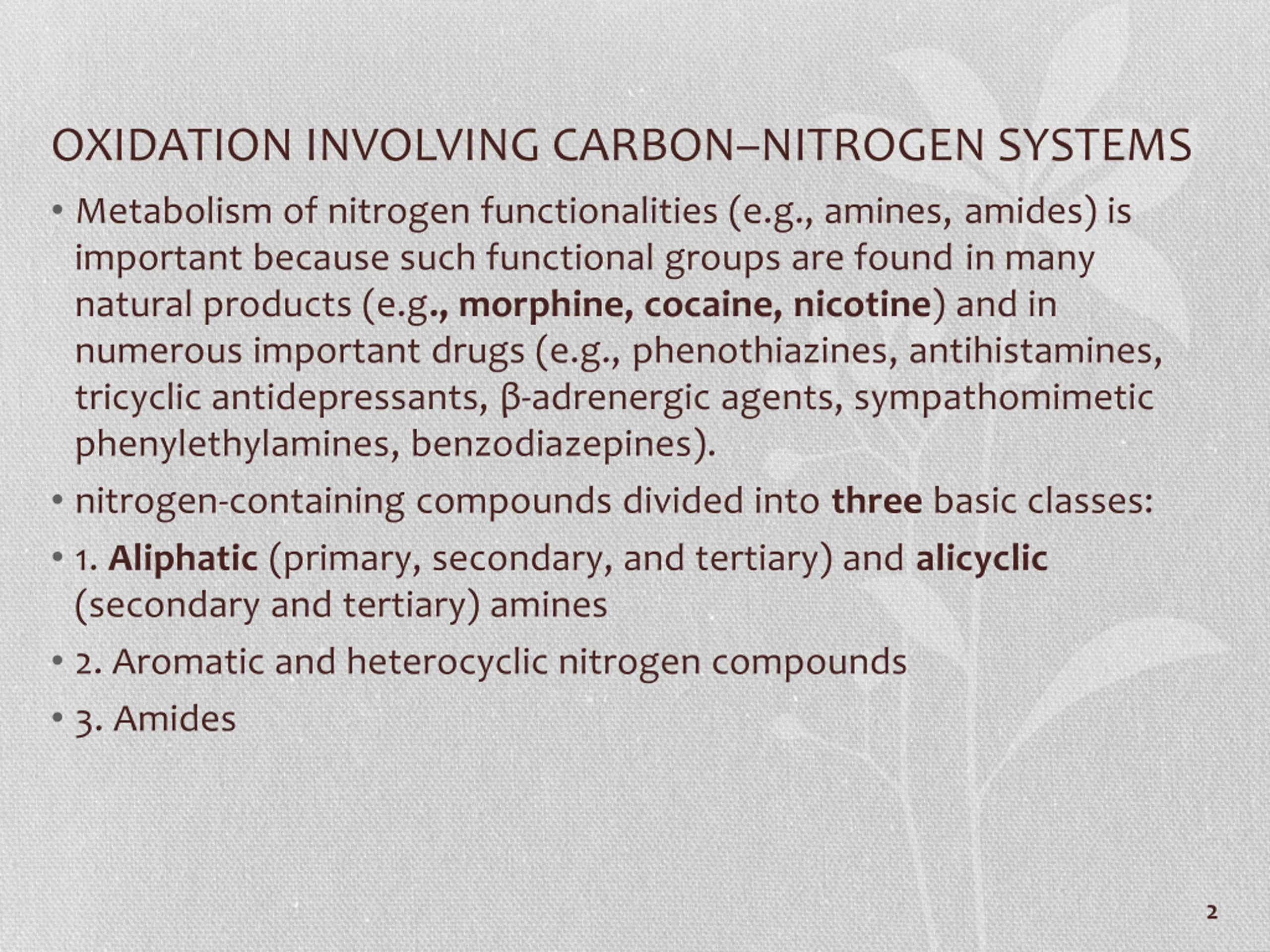 OXIDATION INVOLVING CARBONNITROGEN SYSTEMS Metabolism of nitrogen functionalities (e.g., amines, amides) is important because such functional groups are found in many natural products (e.g., morphine, cocaine, nicotine) and in numerous important drugs (e.g., phenothiazines, antihistamines, tricyclic antidepressants, -adrenergic agents, sympathomimetic phenylethylamines, benzodiazepines). nitrogen-containing compounds divided into three basic classes: 1. Aliphatic (primary, secondary, and tertiary) and alicyclic (secondary and tertiary) amines 2. Aromatic and heterocyclic nitrogen compounds 3. Amides 2