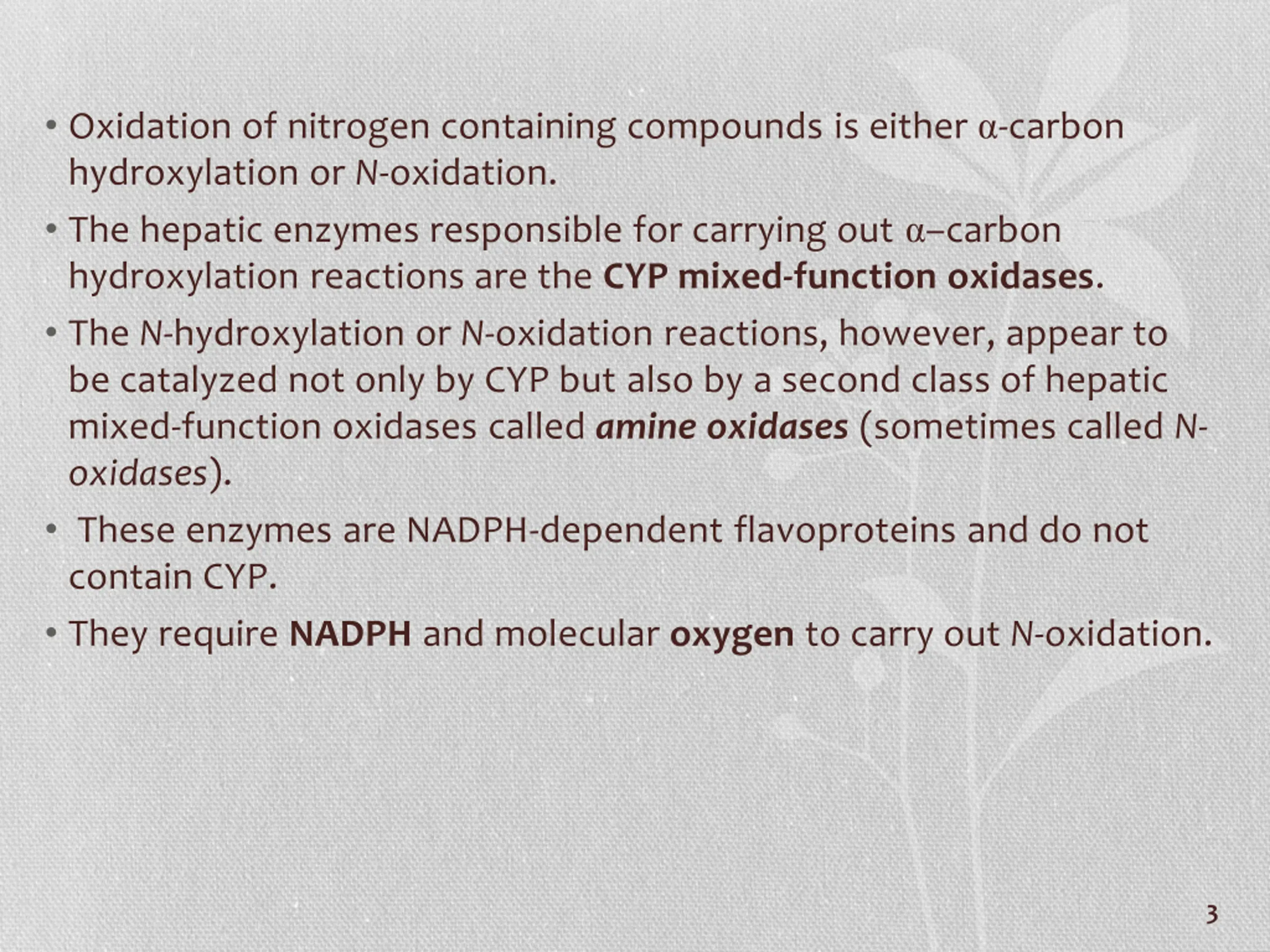 Oxidation of nitrogen containing compounds is either -carbon hydroxylation or N-oxidation. The hepatic enzymes responsible for carrying out carbon hydroxylation reactions are the CYP mixed-function oxidases. The N-hydroxylation or N-oxidation reactions, however, appear to be catalyzed not only by CYP but also by a second class of hepatic mixed-function oxidases called amine oxidases (sometimes called N- oxidases). These enzymes are NADPH-dependent flavoproteins and do not contain CYP. They require NADPH and molecular oxygen to carry out N-oxidation. 3