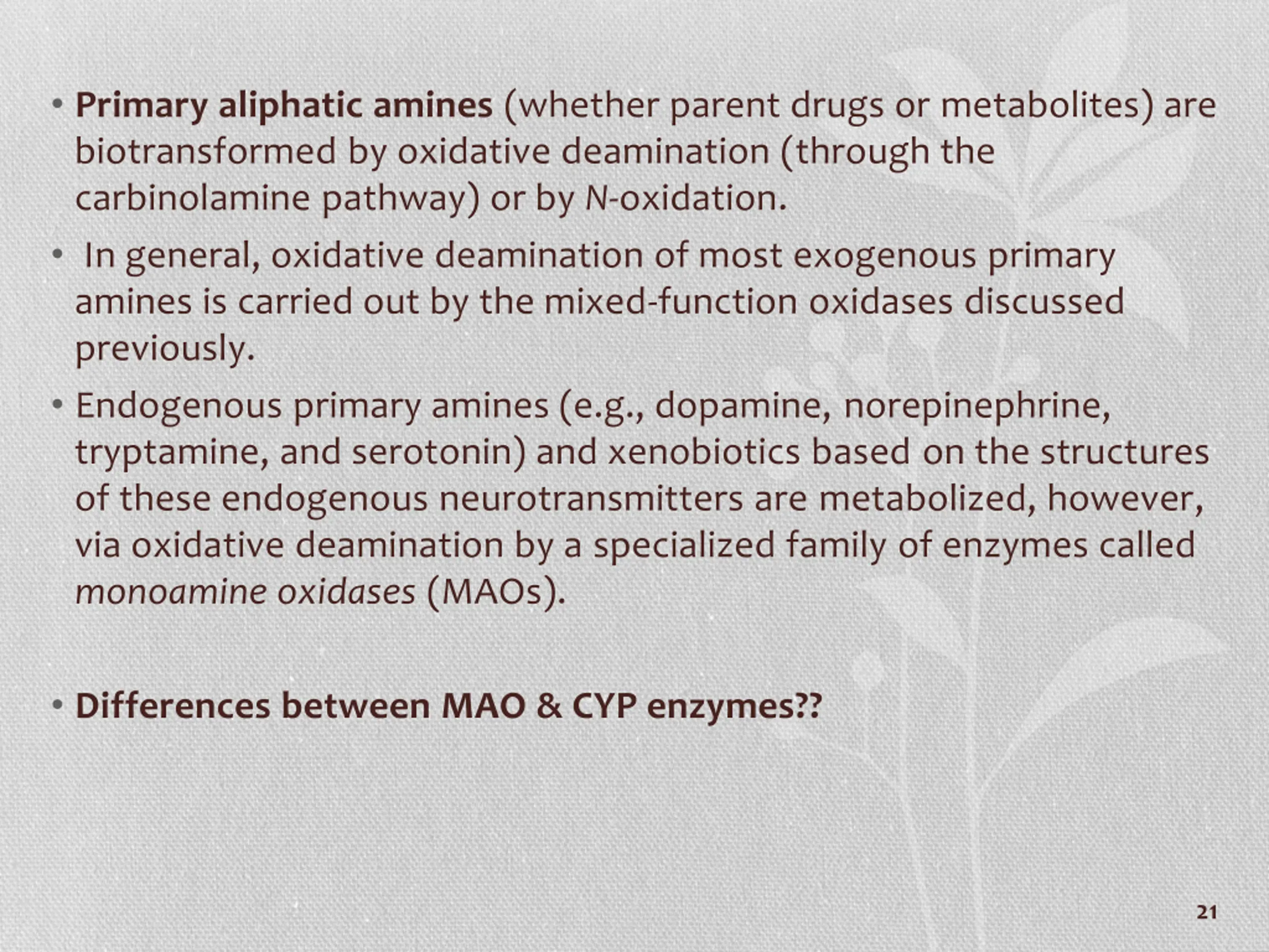 Primary aliphatic amines (whether parent drugs or metabolites) are biotransformed by oxidative deamination (through the carbinolamine pathway) or by N-oxidation. In general, oxidative deamination of most exogenous primary amines is carried out by the mixed-function oxidases discussed previously. Endogenous primary amines (e.g., dopamine, norepinephrine, tryptamine, and serotonin) and xenobiotics based on the structures of these endogenous neurotransmitters are metabolized, however, via oxidative deamination by a specialized family of enzymes called monoamine oxidases (MAOs). Differences between MAO & CYP enzymes?? 21