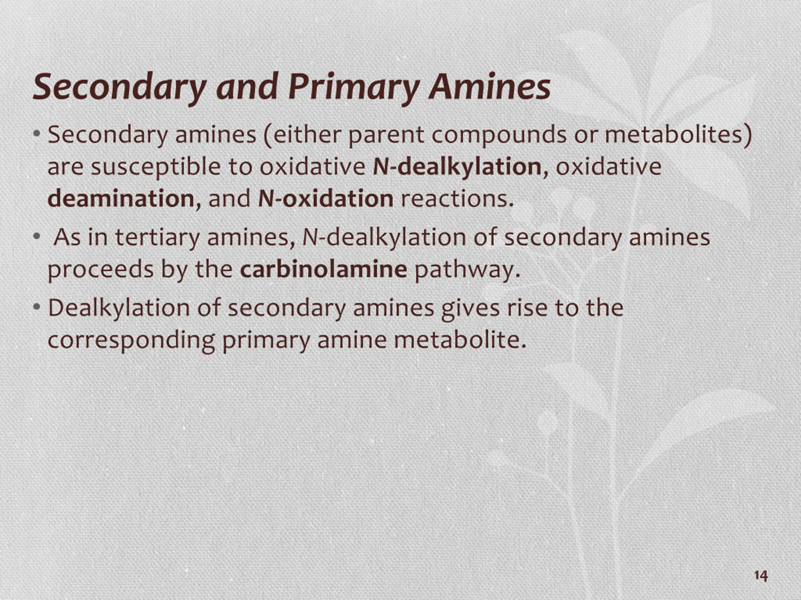 Secondary and Primary Amines Secondary amines (either parent compounds or metabolites) are susceptible to oxidative N-dealkylation, oxidative deamination, and N-oxidation reactions. As in tertiary amines, N-dealkylation of secondary amines proceeds by the carbinolamine pathway. Dealkylation of secondary amines gives rise to the corresponding primary amine metabolite. 14