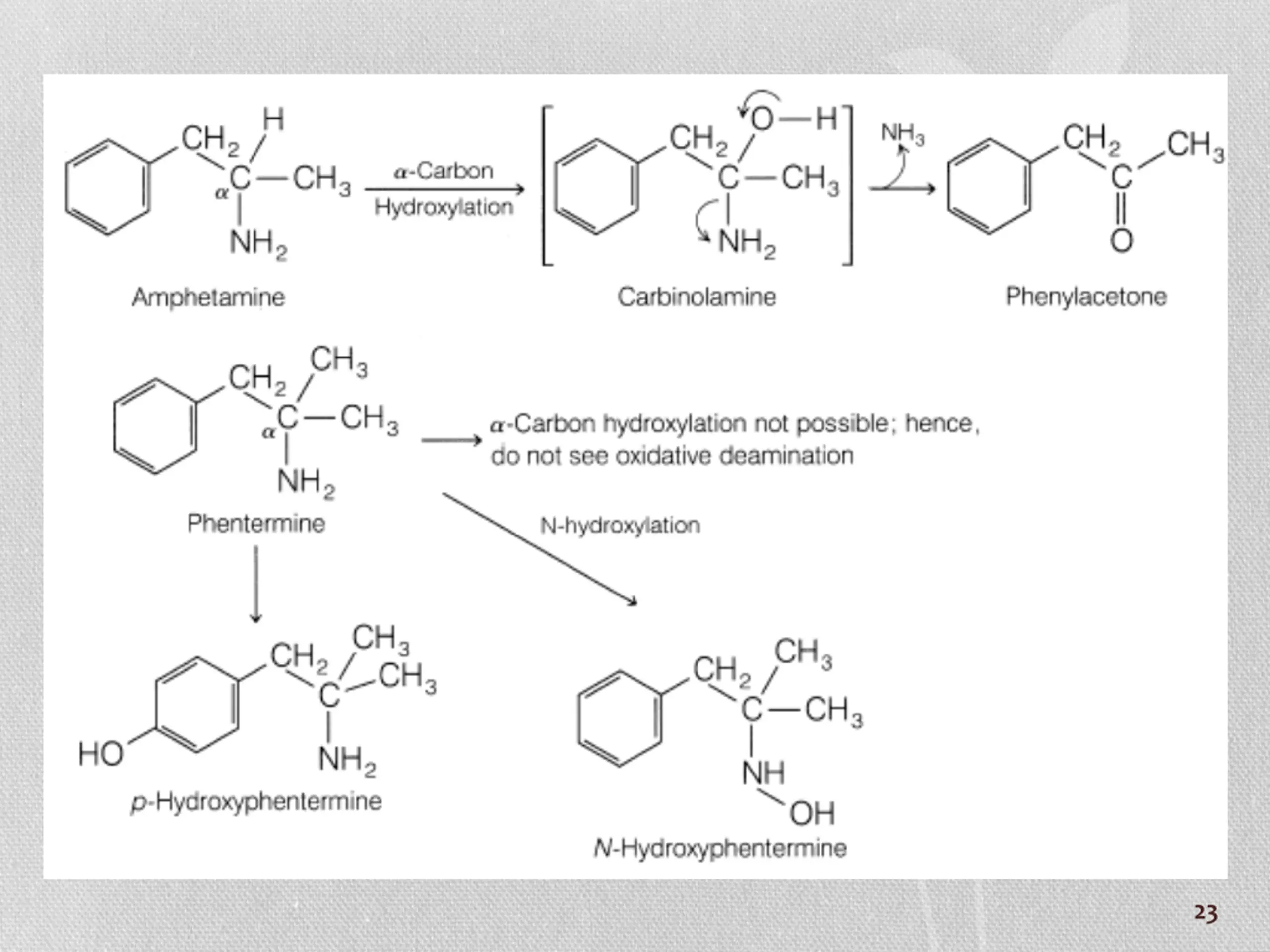 Structural features, especially the -substituents of the primary amine, often determine whether carbon or nitrogen oxidation will occur. For example, compare amphetamine with its -methyl homologue phentermine. 22