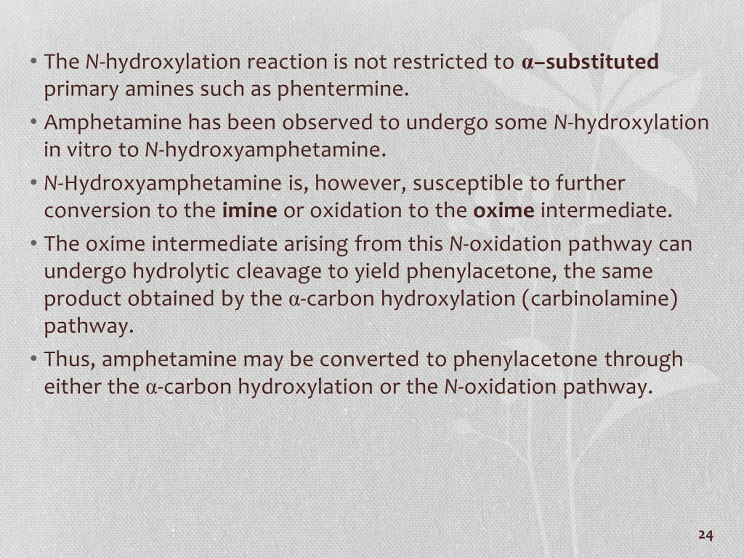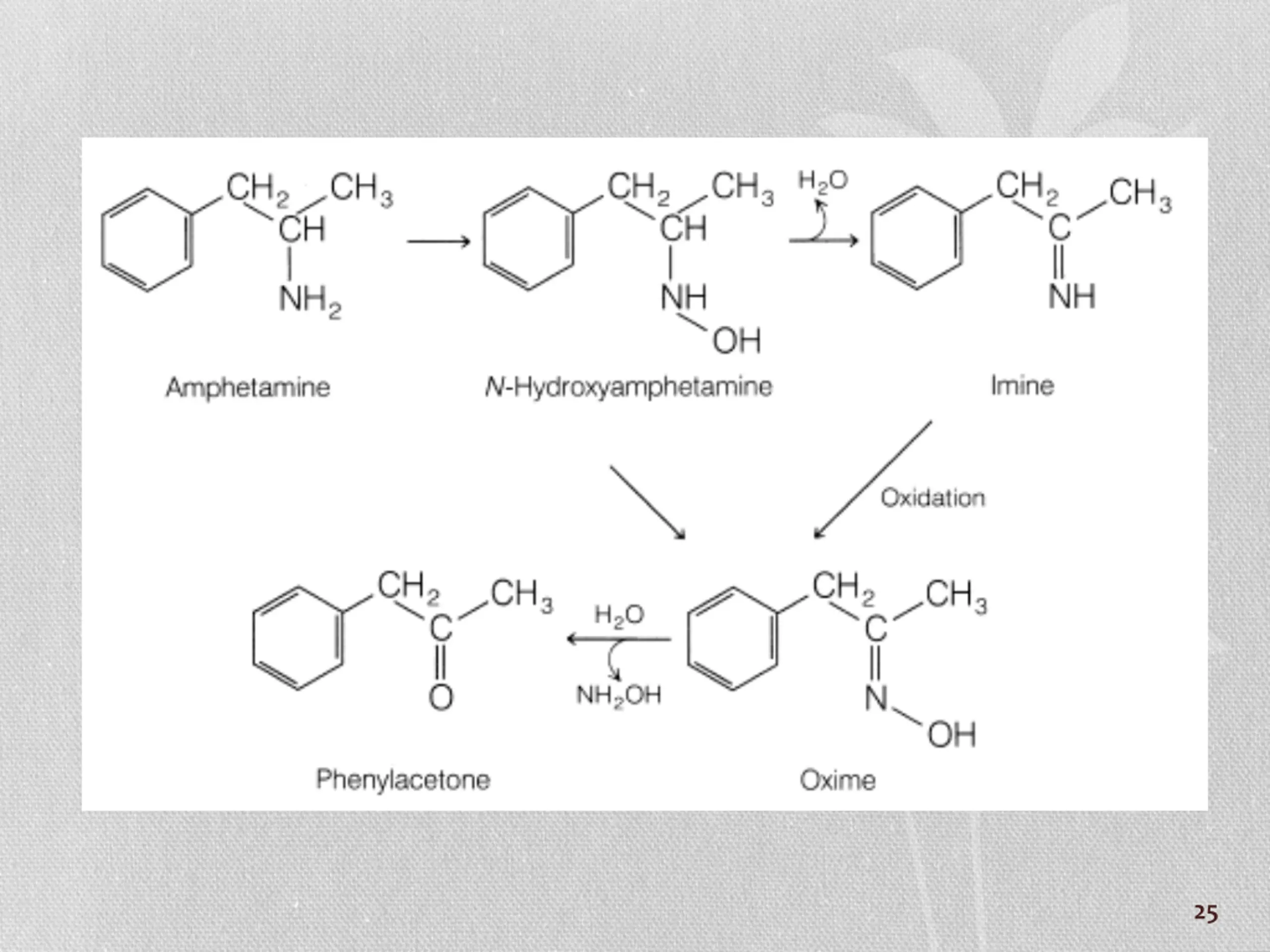 The N-hydroxylation reaction is not restricted to substituted primary amines such as phentermine. Amphetamine has been observed to undergo some N-hydroxylation in vitro to N-hydroxyamphetamine. N-Hydroxyamphetamine is, however, susceptible to further conversion to the imine or oxidation to the oxime intermediate. The oxime intermediate arising from this N-oxidation pathway can undergo hydrolytic cleavage to yield phenylacetone, the same product obtained by the -carbon hydroxylation (carbinolamine) pathway. Thus, amphetamine may be converted to phenylacetone through either the -carbon hydroxylation or the N-oxidation pathway. 24