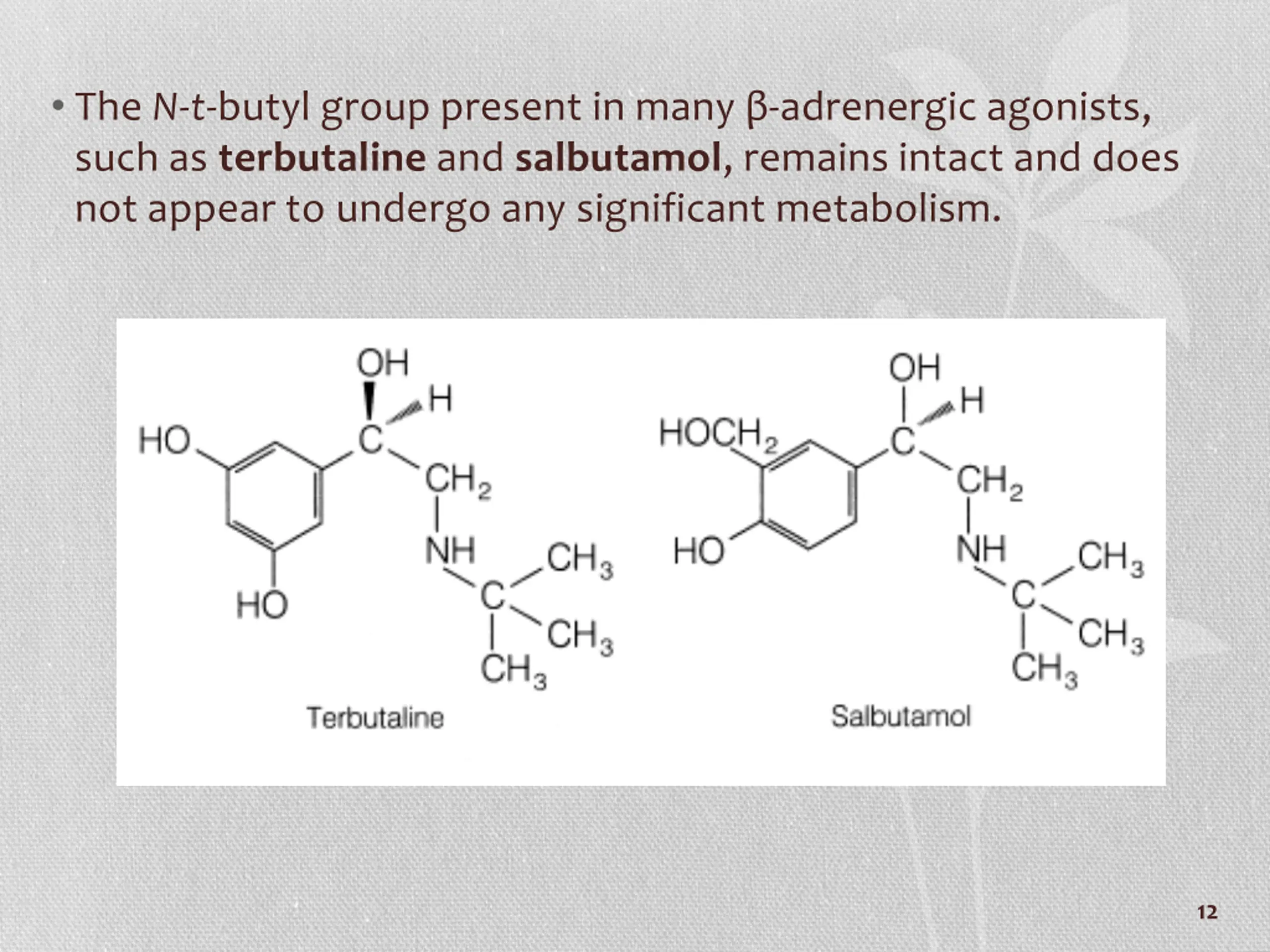 The N-t-butyl group present in many -adrenergic agonists, such as terbutaline and salbutamol, remains intact and does not appear to undergo any significant metabolism. 12