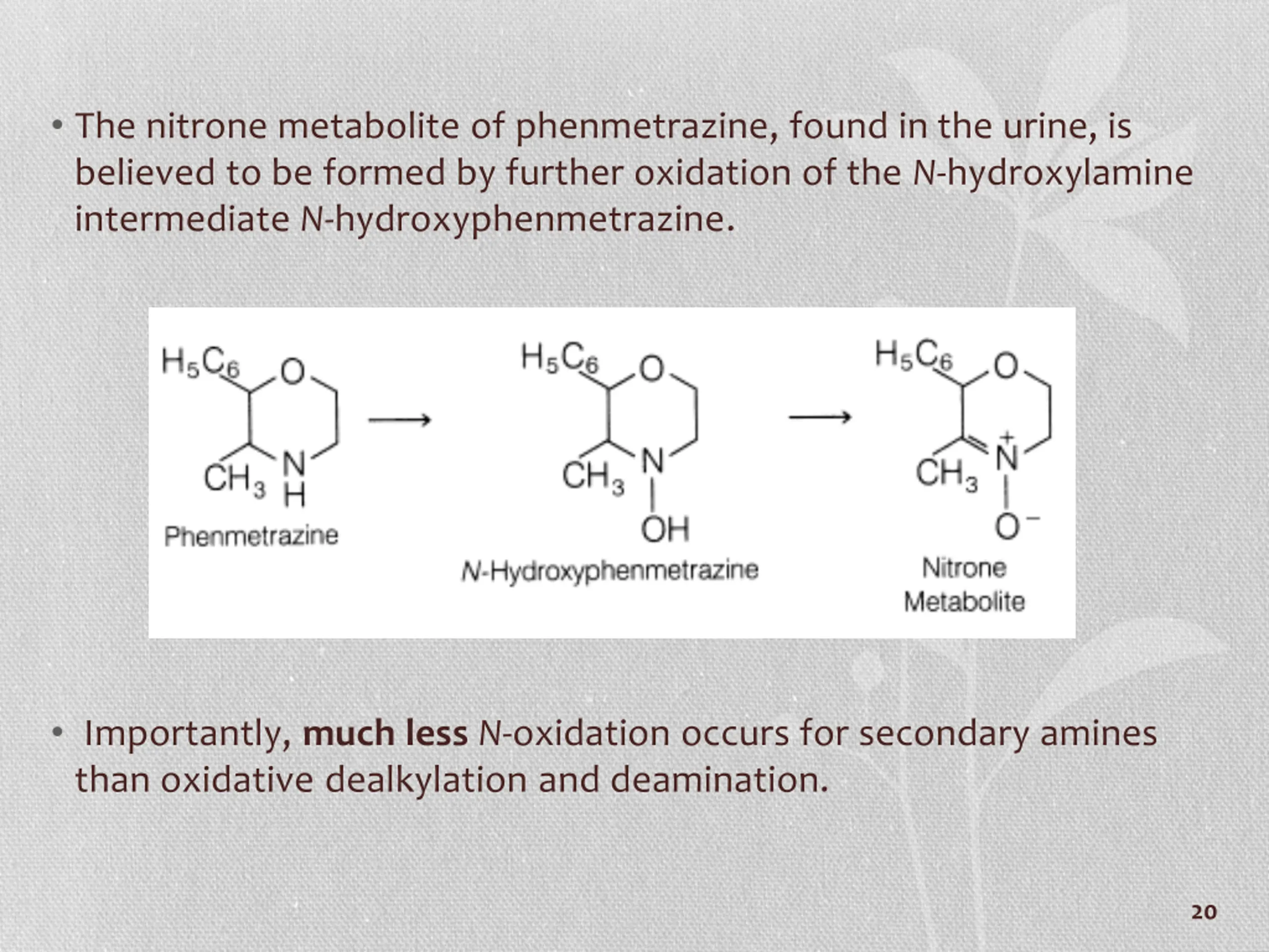 The nitrone metabolite of phenmetrazine, found in the urine, is believed to be formed by further oxidation of the N-hydroxylamine intermediate N-hydroxyphenmetrazine. Importantly, much less N-oxidation occurs for secondary amines than oxidative dealkylation and deamination. 20