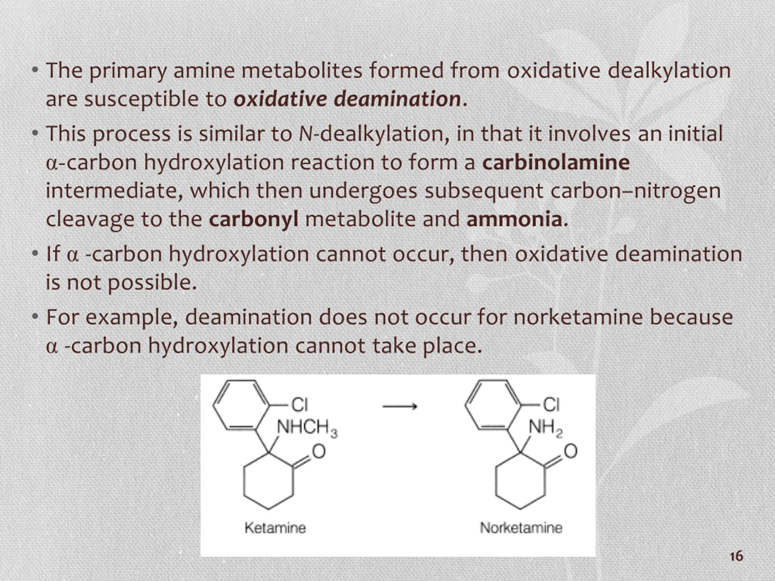 The primary amine metabolites formed from oxidative dealkylation are susceptible to oxidative deamination. This process is similar to N-dealkylation, in that it involves an initial -carbon hydroxylation reaction to form a carbinolamine intermediate, which then undergoes subsequent carbon nitrogen cleavage to the carbonyl metabolite and ammonia. If -carbon hydroxylation cannot occur, then oxidative deamination is not possible. For example, deamination does not occur for norketamine because -carbon hydroxylation cannot take place. 16