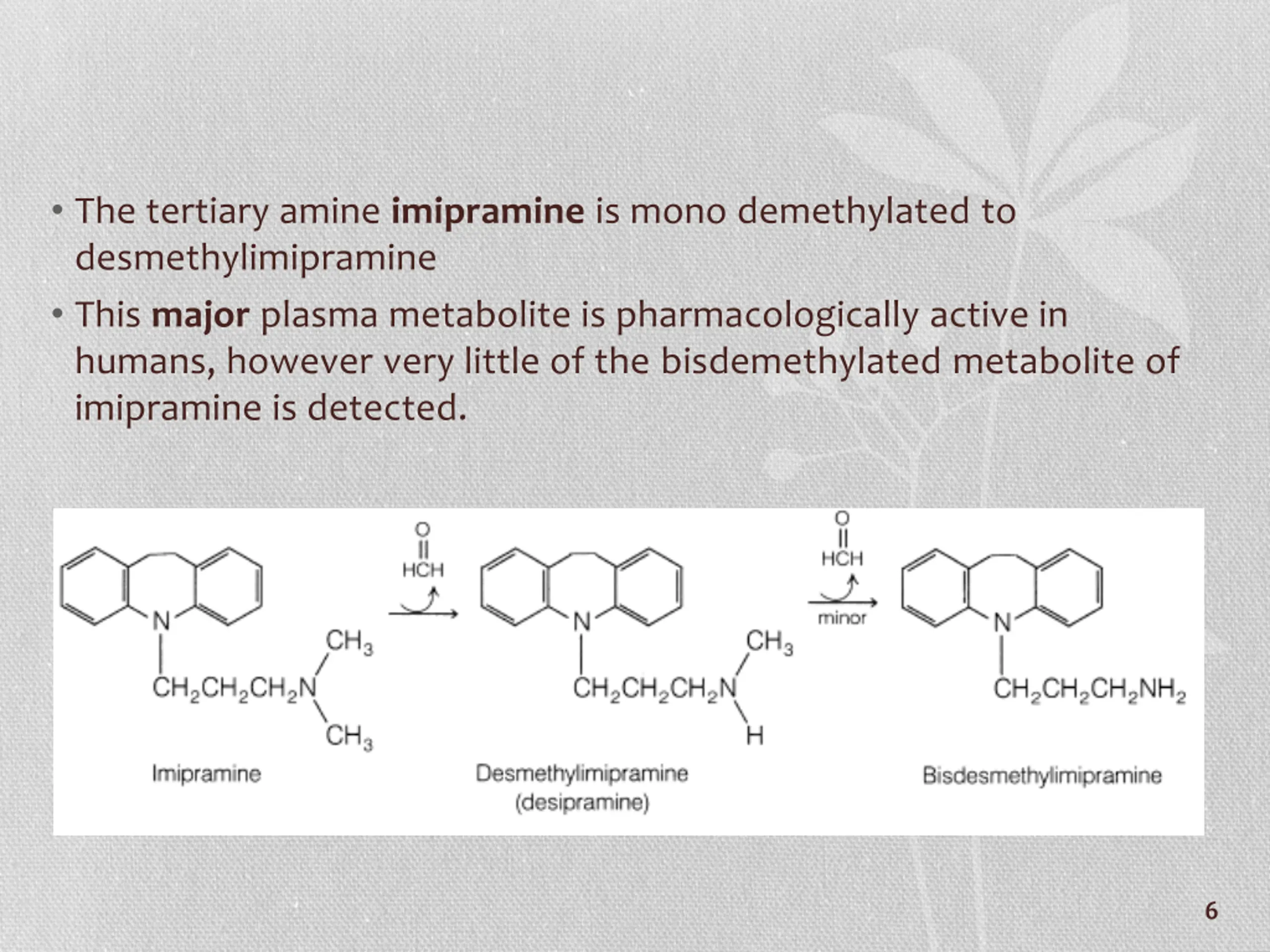 The tertiary amine imipramine is mono demethylated to desmethylimipramine This major plasma metabolite is pharmacologically active in humans, however very little of the bisdemethylated metabolite of imipramine is detected. 6
