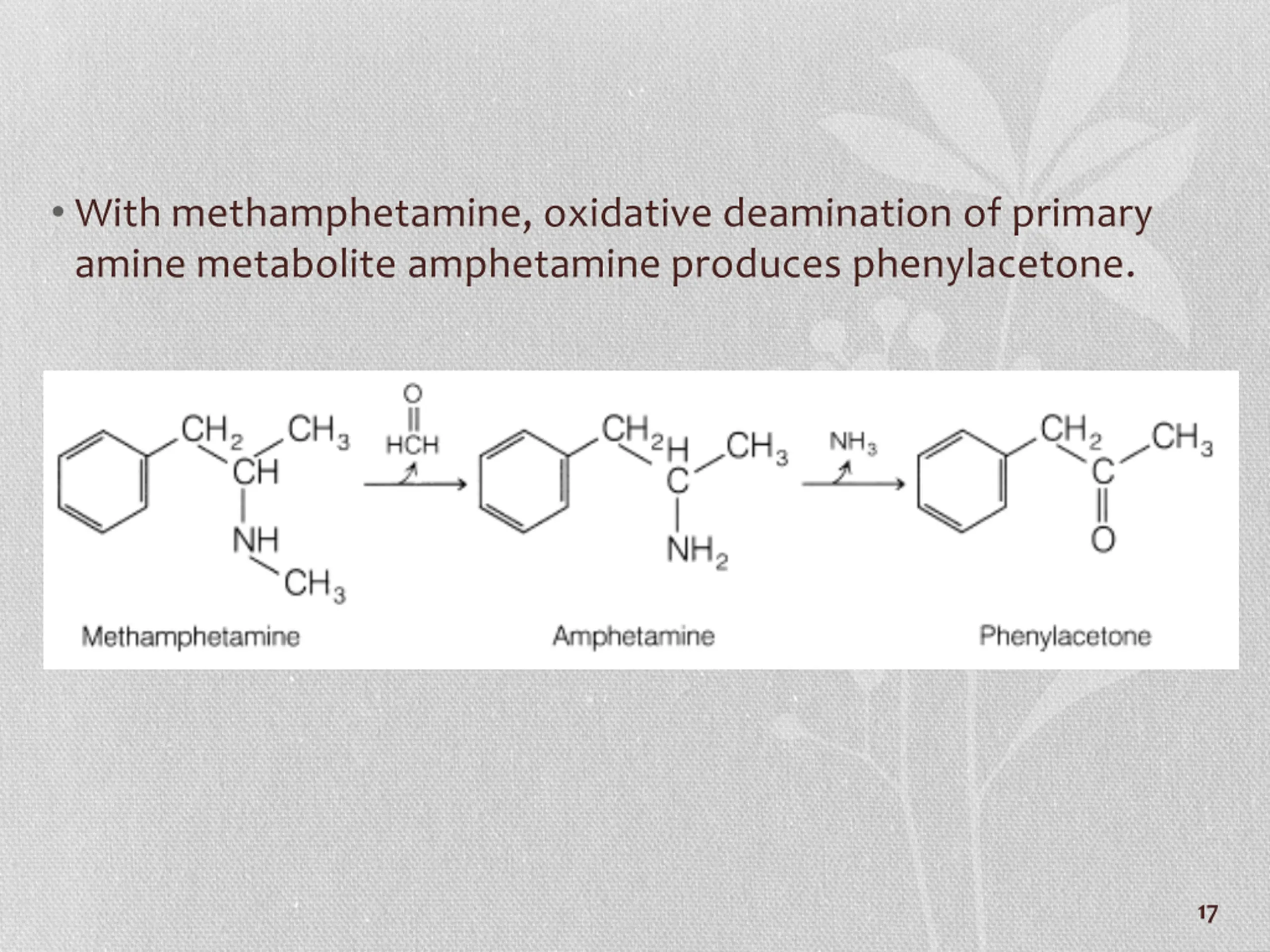 With methamphetamine, oxidative deamination of primary amine metabolite amphetamine produces phenylacetone. 17