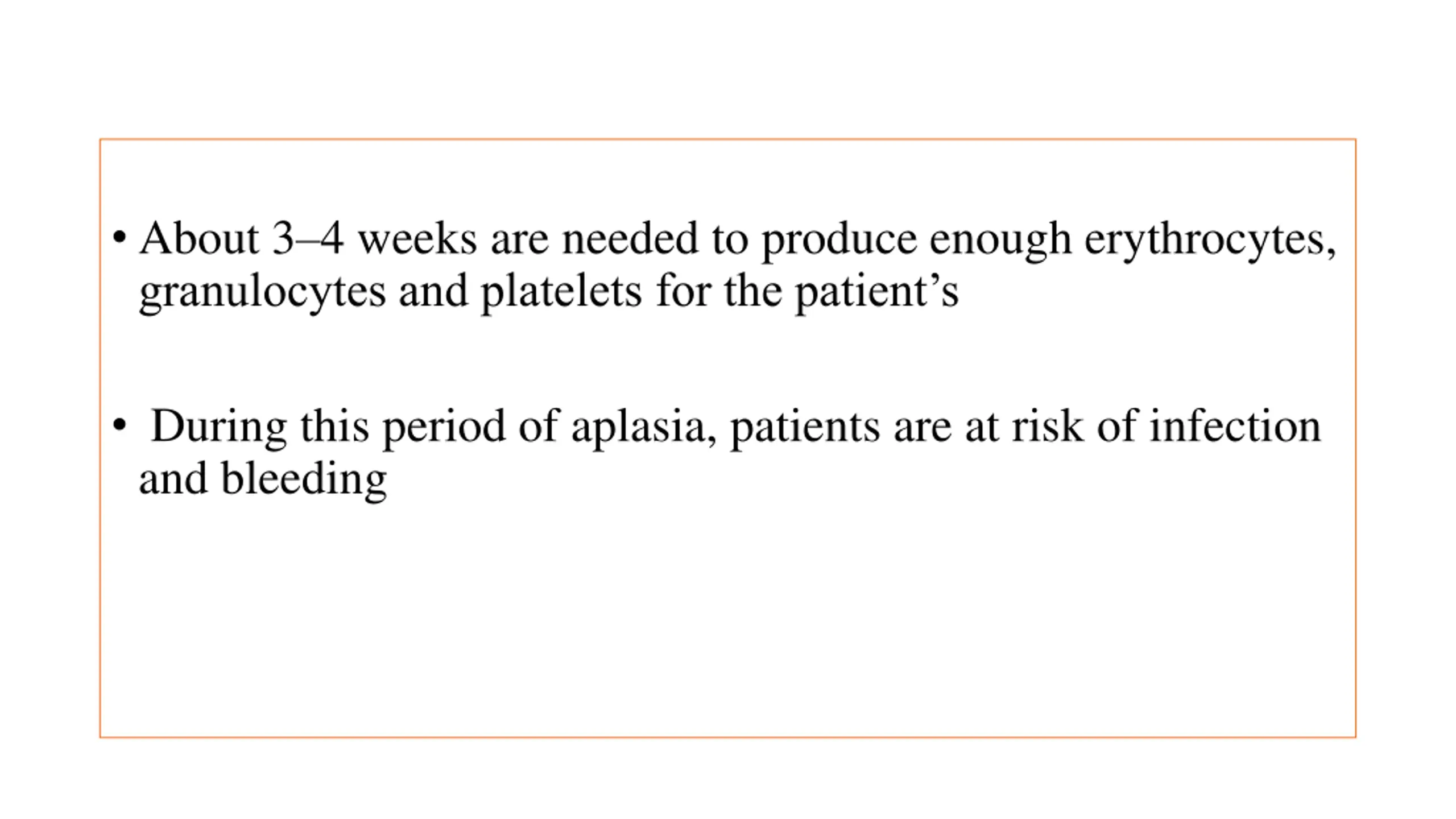 About 34 weeks are needed to produce enough erythrocytes, granulocytes and platelets for the patient s During this period of aplasia, patients are at risk of infection and bleeding