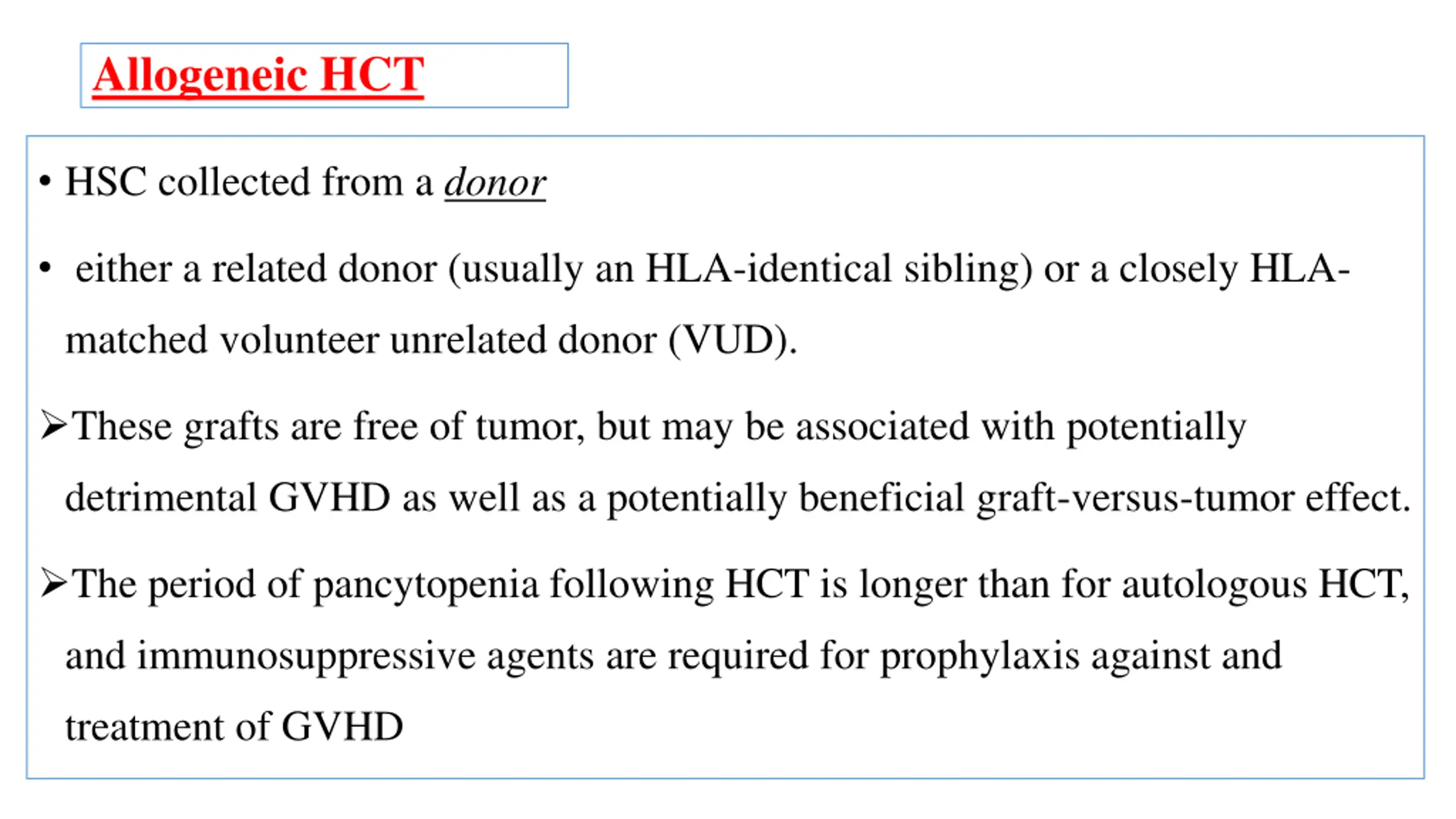 Allogeneic HCT HSC collected from a donor either a related donor (usually an HLA-identical sibling) or a closely HLA- matched volunteer unrelated donor (VUD). These grafts are free of tumor, but may be associated with potentially detrimental GVHD as well as a potentially beneficial graft-versus-tumor effect. The period of pancytopenia following HCT is longer than for autologous HCT, and immunosuppressive agents are required for prophylaxis against and treatment of GVHD