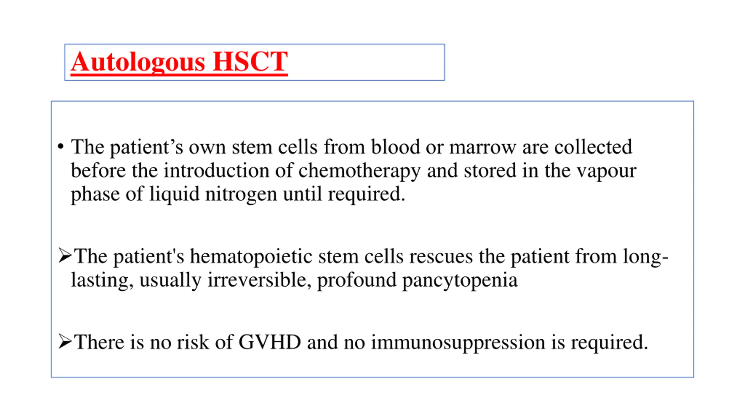 Autologous HSCT The patient s own stem cells from blood or marrow are collected before the introduction of chemotherapy and stored in the vapour phase of liquid nitrogen until required. The patient's hematopoietic stem cells rescues the patient from long- lasting, usually irreversible, profound pancytopenia There is no risk of GVHD and no immunosuppression is required.