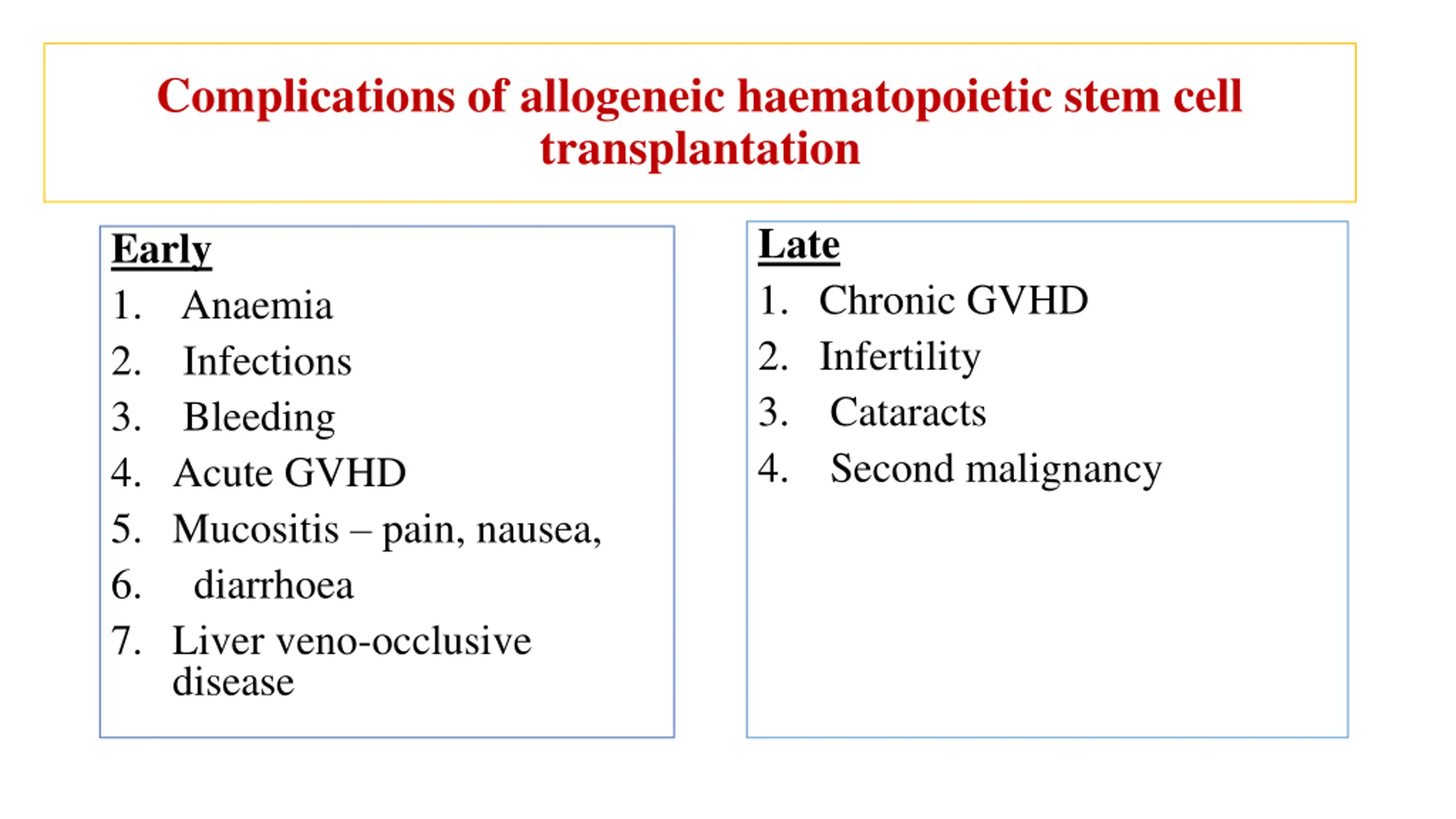 Complications of allogeneic haematopoietic stem cell transplantation Late 1. Chronic GVHD 2. Infertility 3. Cataracts 4. Second malignancy Early 1. Anaemia 2. Infections 3. Bleeding 4. Acute GVHD 5. Mucositis pain, nausea, 6. diarrhoea 7. Liver veno-occlusive disease