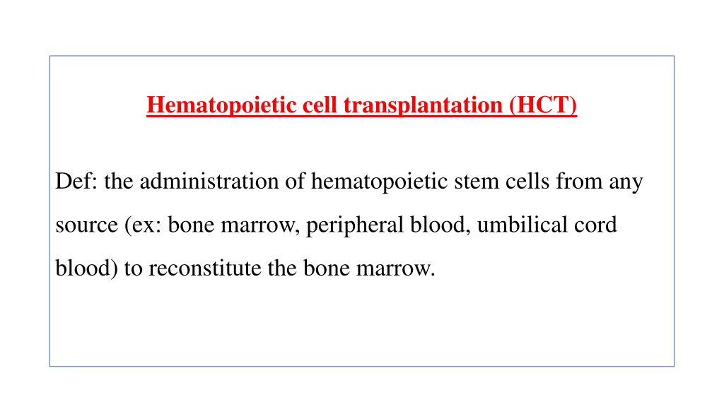 Hematopoietic cell transplantation (HCT) Def: the administration of hematopoietic stem cells from any source (ex: bone marrow, peripheral blood, umbilical cord blood) to reconstitute the bone marrow.