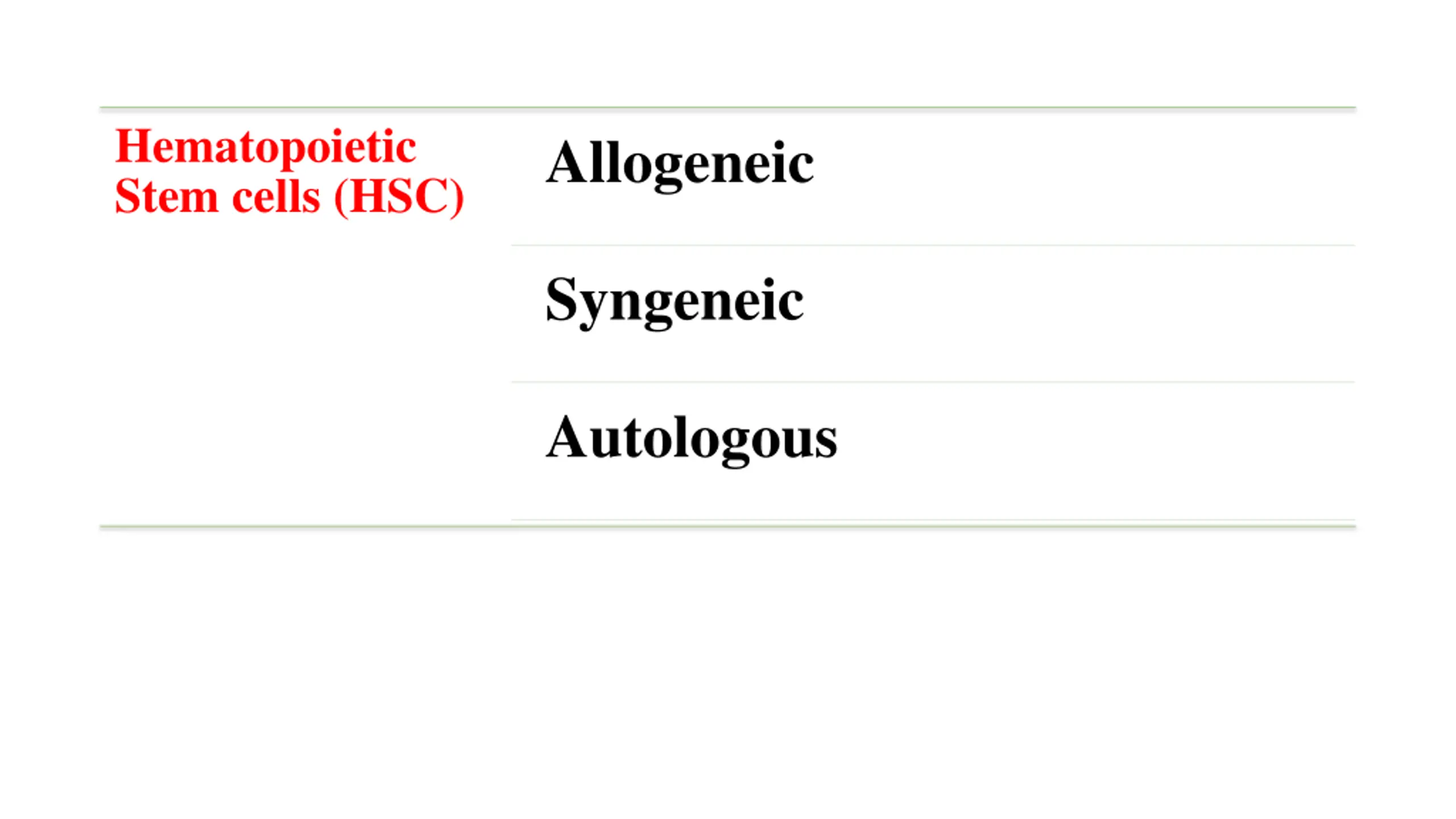Hematopoietic Stem cells (HSC) Allogeneic Syngeneic Autologous