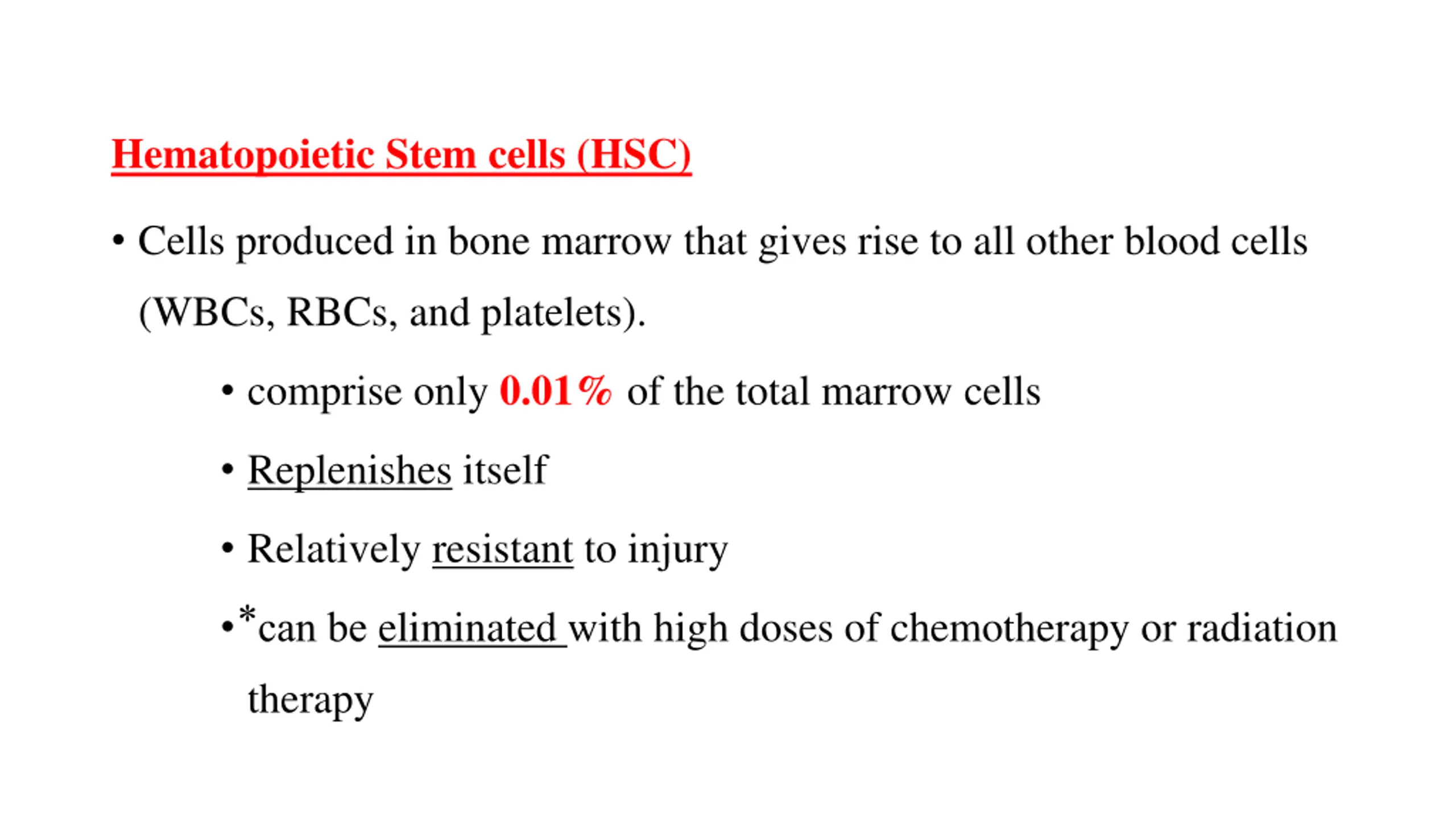 Hematopoietic Stem cells (HSC) Cells produced in bone marrow that gives rise to all other blood cells (WBCs, RBCs, and platelets). comprise only 0.01% of the total marrow cells Replenishes itself Relatively resistant to injury can be eliminated with high doses of chemotherapy or radiation therapy