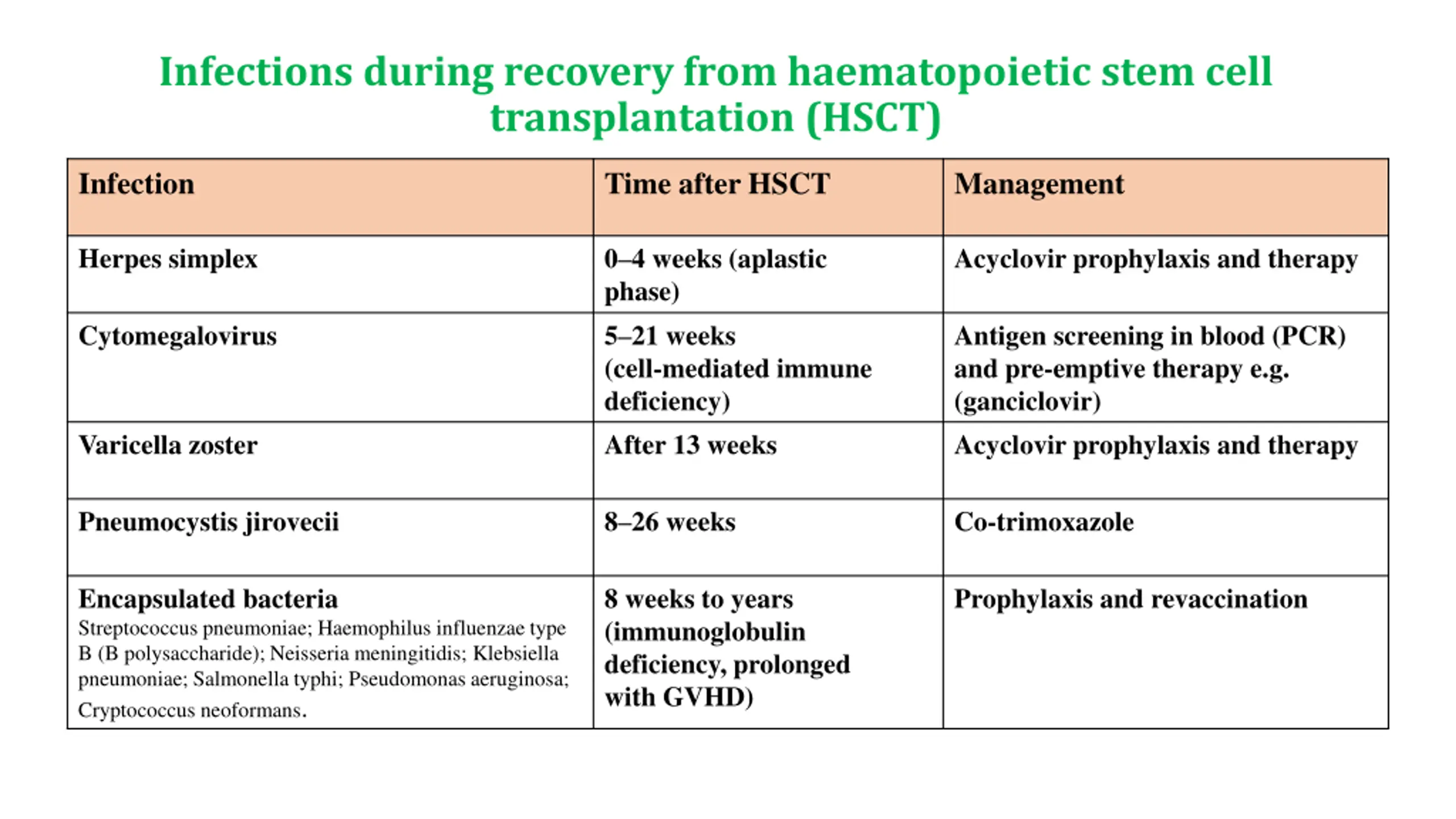 Infections during recovery from haematopoietic stem cell transplantation (HSCT) Infection Time after HSCT Management Herpes simplex 0 4 weeks (aplastic phase) 5 21 weeks (cell-mediated immune deficiency) After 13 weeks Acyclovir prophylaxis and therapy Cytomegalovirus Antigen screening in blood (PCR) and pre-emptive therapy e.g. (ganciclovir) Acyclovir prophylaxis and therapy Varicella zoster Pneumocystis jirovecii 8 26 weeks Co-trimoxazole Encapsulated bacteria Streptococcus pneumoniae; Haemophilus influenzae type B (B polysaccharide); Neisseria meningitidis; Klebsiella pneumoniae; Salmonella typhi; Pseudomonas aeruginosa; Cryptococcus neoformans. 8 weeks to years (immunoglobulin deficiency, prolonged with GVHD) Prophylaxis and revaccination