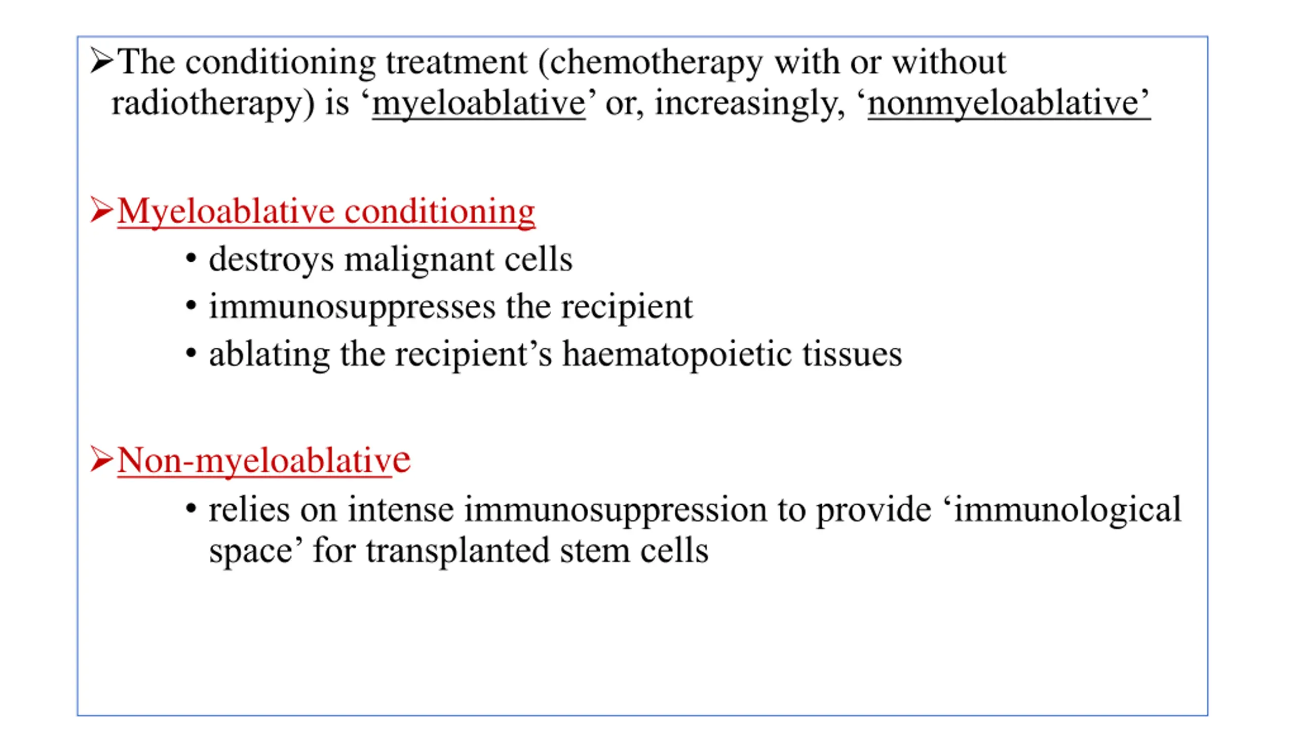 The conditioning treatment (chemotherapy with or without radiotherapy) is myeloablative or, increasingly, nonmyeloablative Myeloablative conditioning destroys malignant cells immunosuppresses the recipient ablating the recipient s haematopoietic tissues Non-myeloablative relies on intense immunosuppression to provide immunological space for transplanted stem cells