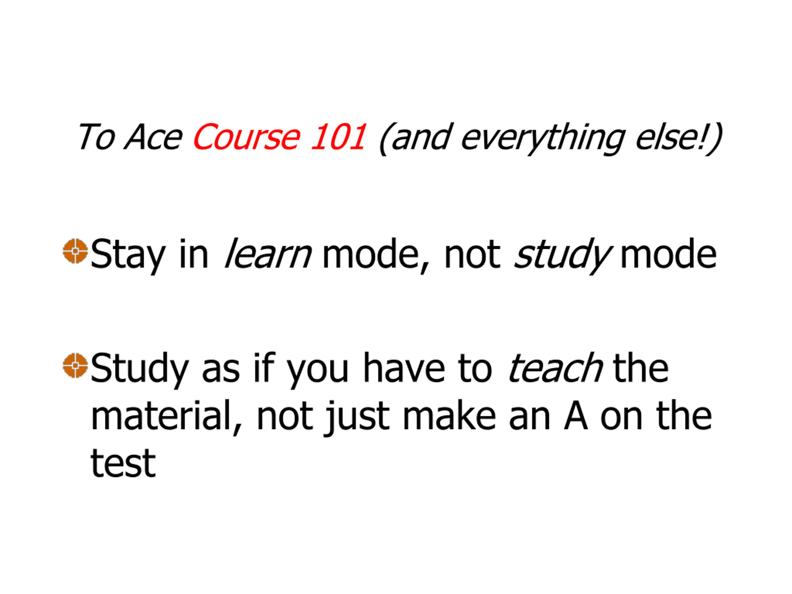 To Ace Course 101 (and everything else!) Stay in learn mode, not study mode Study as if you have to teach the material, not just make an A on the test