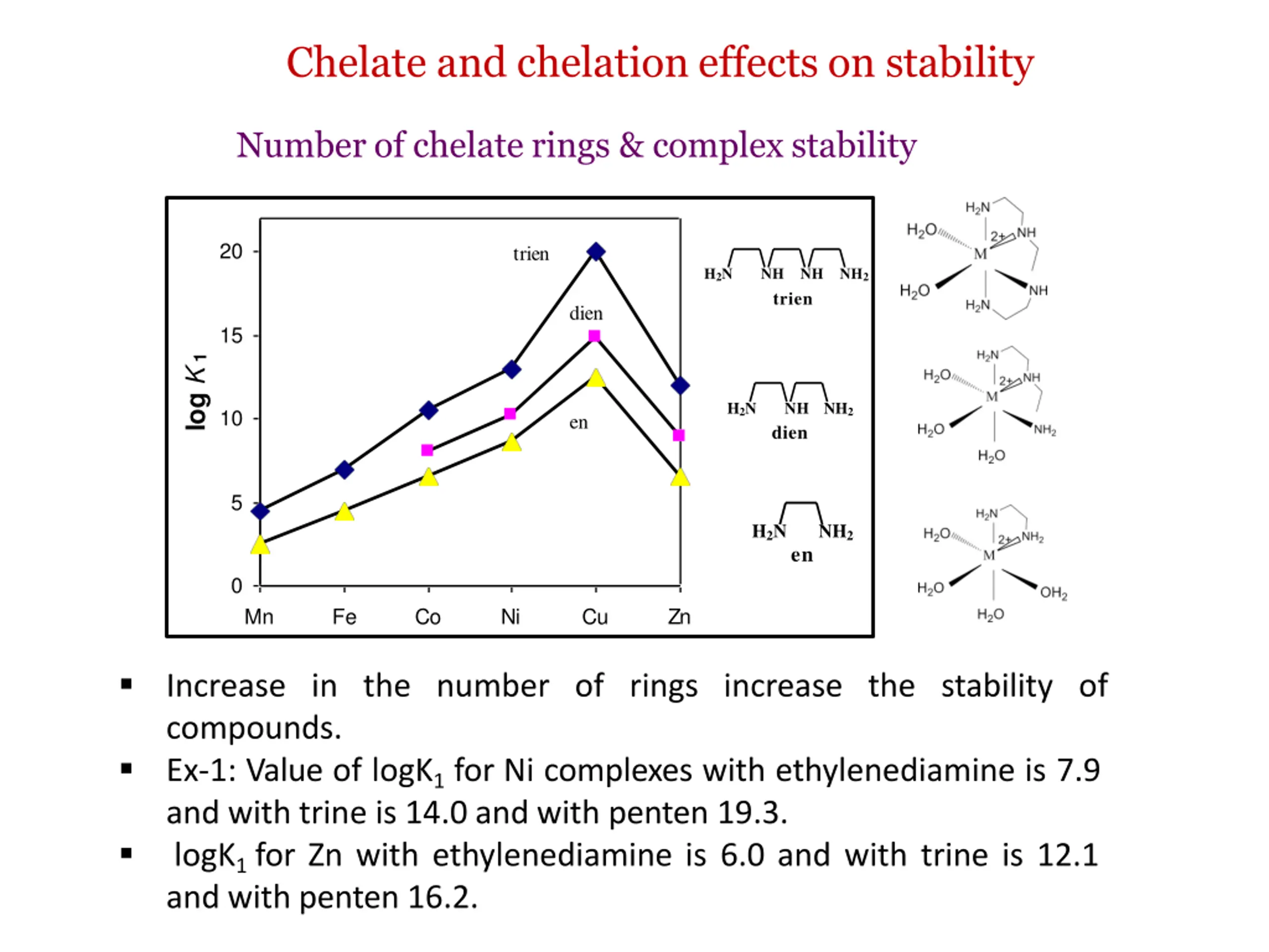 Chelate and chelation effects on stability Number of chelate rings & complex stability 20 trien H2N NH NH NH2 trien dien 15 log K 1 H2N NH NH2 dien 10 en 5 H2N NH2 en 0 Mn Fe Co Ni Cu Zn Increase in the number of rings increase the stability of compounds. Ex-1: Value of logK1for Ni complexes with ethylenediamine is 7.9 and with trine is 14.0 and with penten 19.3. logK1for Zn with ethylenediamine is 6.0 and with trine is 12.1 and with penten 16.2.
