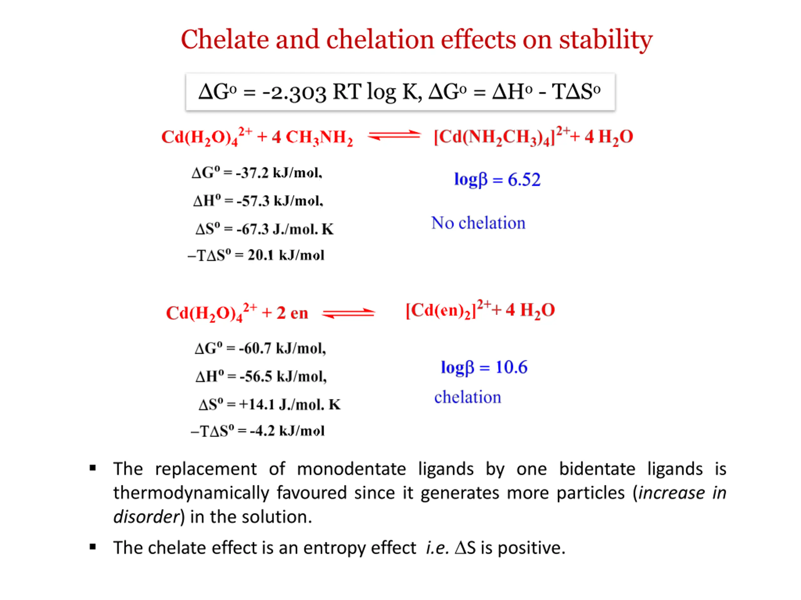 Chelate and chelation effects on stability Go= -2.303 RT log K, Go= Ho- T So The replacement of monodentate ligands by one bidentate ligands is thermodynamically favoured since it generates more particles (increase in disorder) in the solution. The chelate effect is an entropy effect i.e. S is positive.