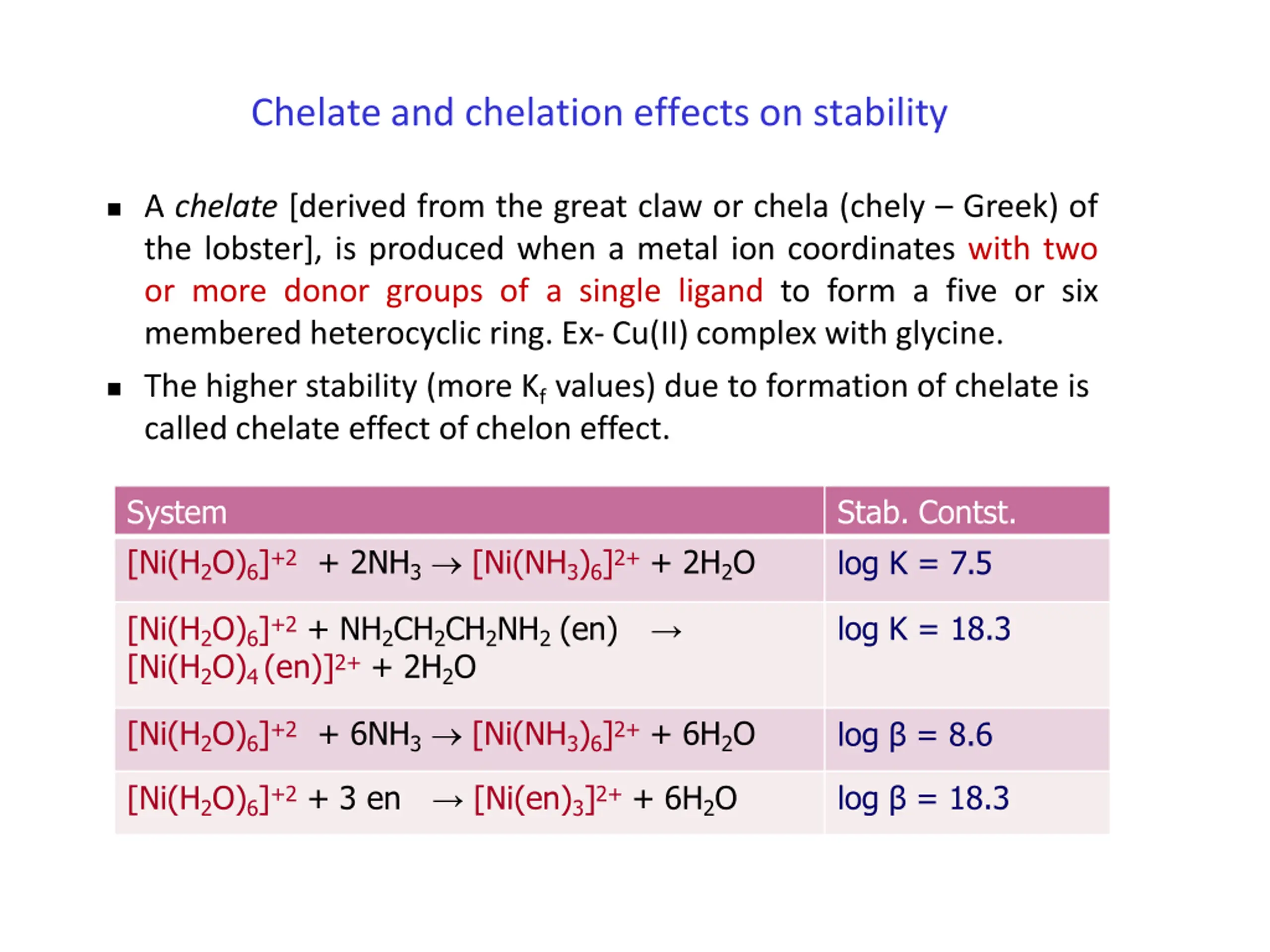 Chelate and chelation effects on stability A chelate [derived from the great claw or chela (chely Greek) of the lobster], is produced when a metal ion coordinates with two or more donor groups of a single ligand to form a five or six membered heterocyclic ring. Ex- Cu(II) complex with glycine. The higher stability (more Kfvalues) due to formation of chelate is called chelate effect of chelon effect. System [Ni(H2O)6]+2+ 2NH3 [Ni(NH3)6]2++ 2H2O Stab. Contst. log K = 7.5 [Ni(H2O)6]+2+ NH2CH2CH2NH2(en) [Ni(H2O)4(en)]2++ 2H2O log K = 18.3 [Ni(H2O)6]+2+ 6NH3 [Ni(NH3)6]2++ 6H2O log = 8.6 [Ni(H2O)6]+2+ 3 en [Ni(en)3]2++ 6H2O log = 18.3