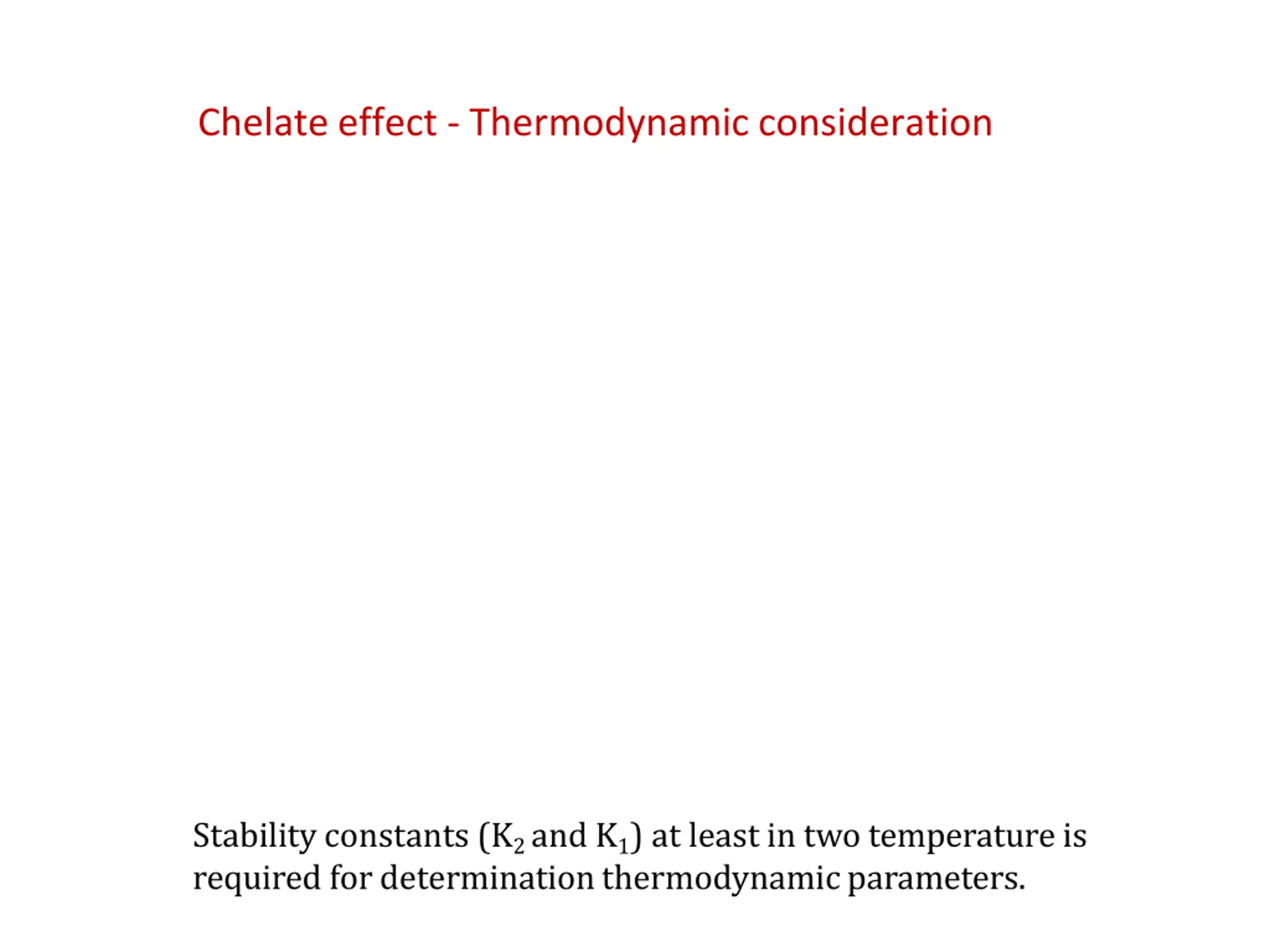 Chelate effect - Thermodynamic consideration Stability constants (K2 and K1) at least in two temperature is required fordeterminationthermodynamicparameters.