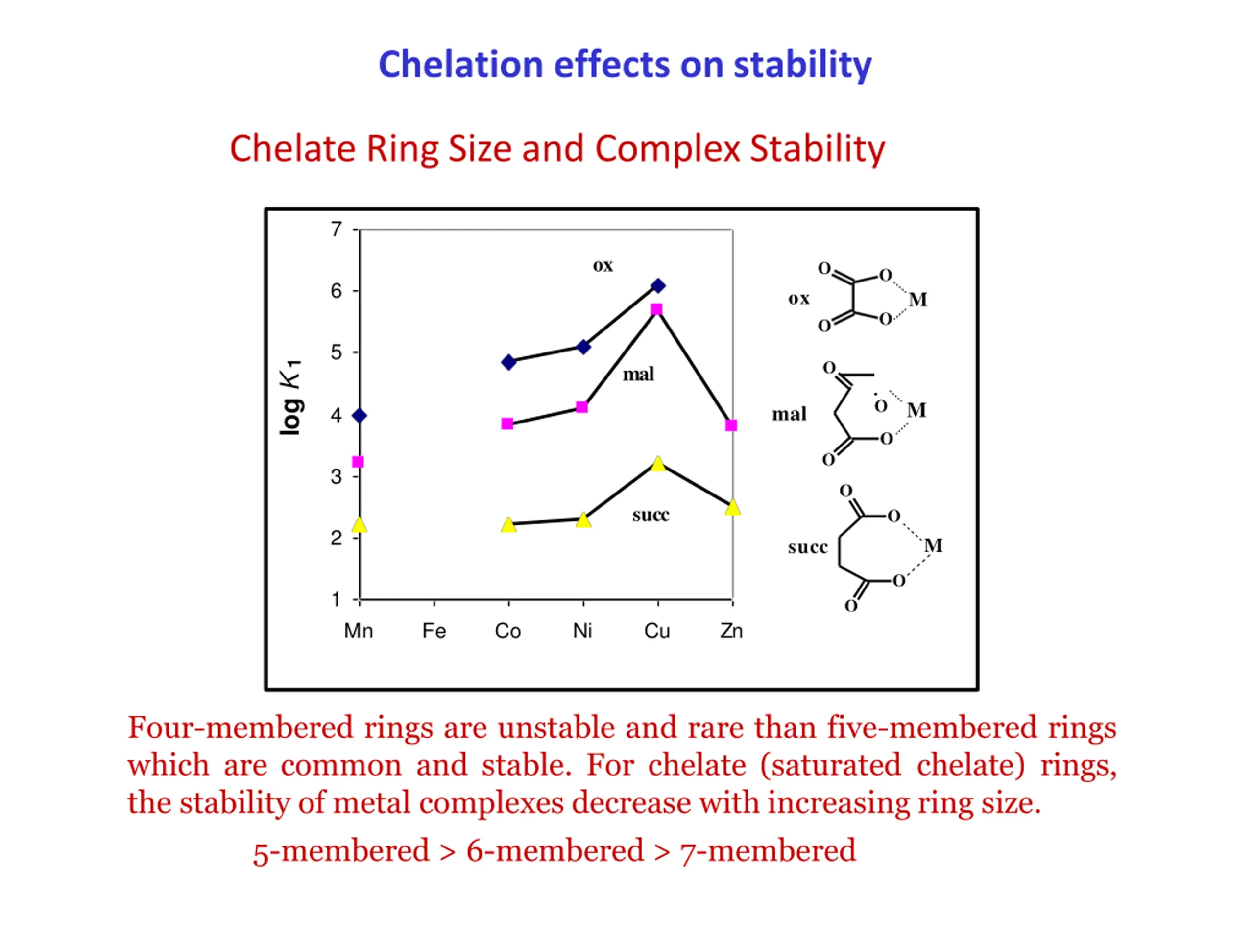 Chelation effects on stability Chelate Ring Size and Complex Stability 7 ox O O 6 ox M O O 5 O log K 1 mal O M mal 4 O O 3 O succ O 2 M succ O 1 O Mn Fe Co Ni Cu Zn Four-membered rings are unstable and rare than five-membered rings which are common and stable. For chelate (saturated chelate) rings, the stability of metal complexes decrease with increasing ring size. 5-membered > 6-membered > 7-membered