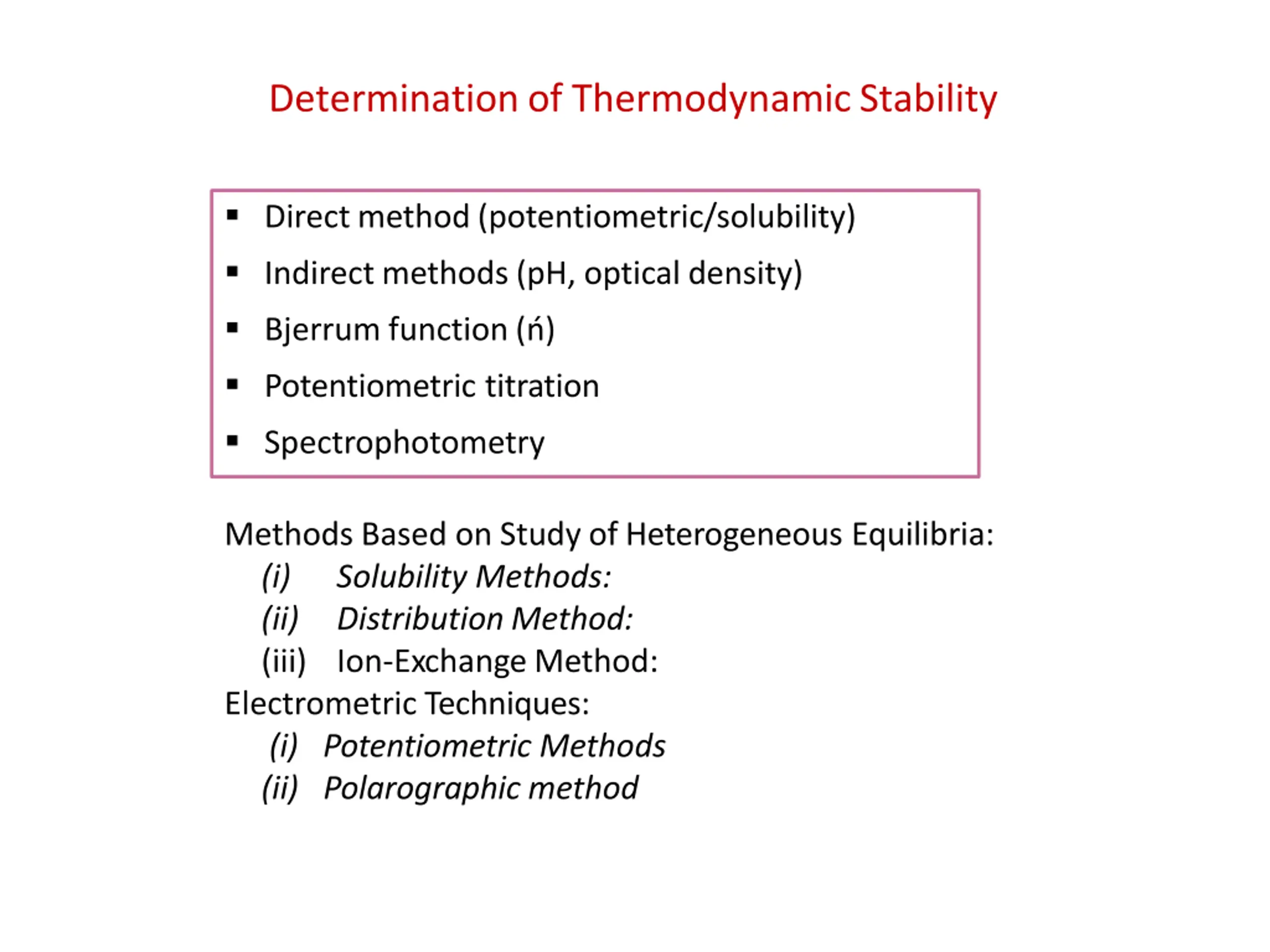 Determinationof ThermodynamicStability Directmethod (potentiometric/solubility) Indirectmethods (pH, optical density) Bjerrum function ( ) Potentiometric titration Spectrophotometry Methods Based on Study of Heterogeneous Equilibria: (i) (ii) (iii) Ion-ExchangeMethod: Electrometric Techniques: (i) Potentiometric Methods (ii) Polarographic method Solubility Methods: Distribution Method: