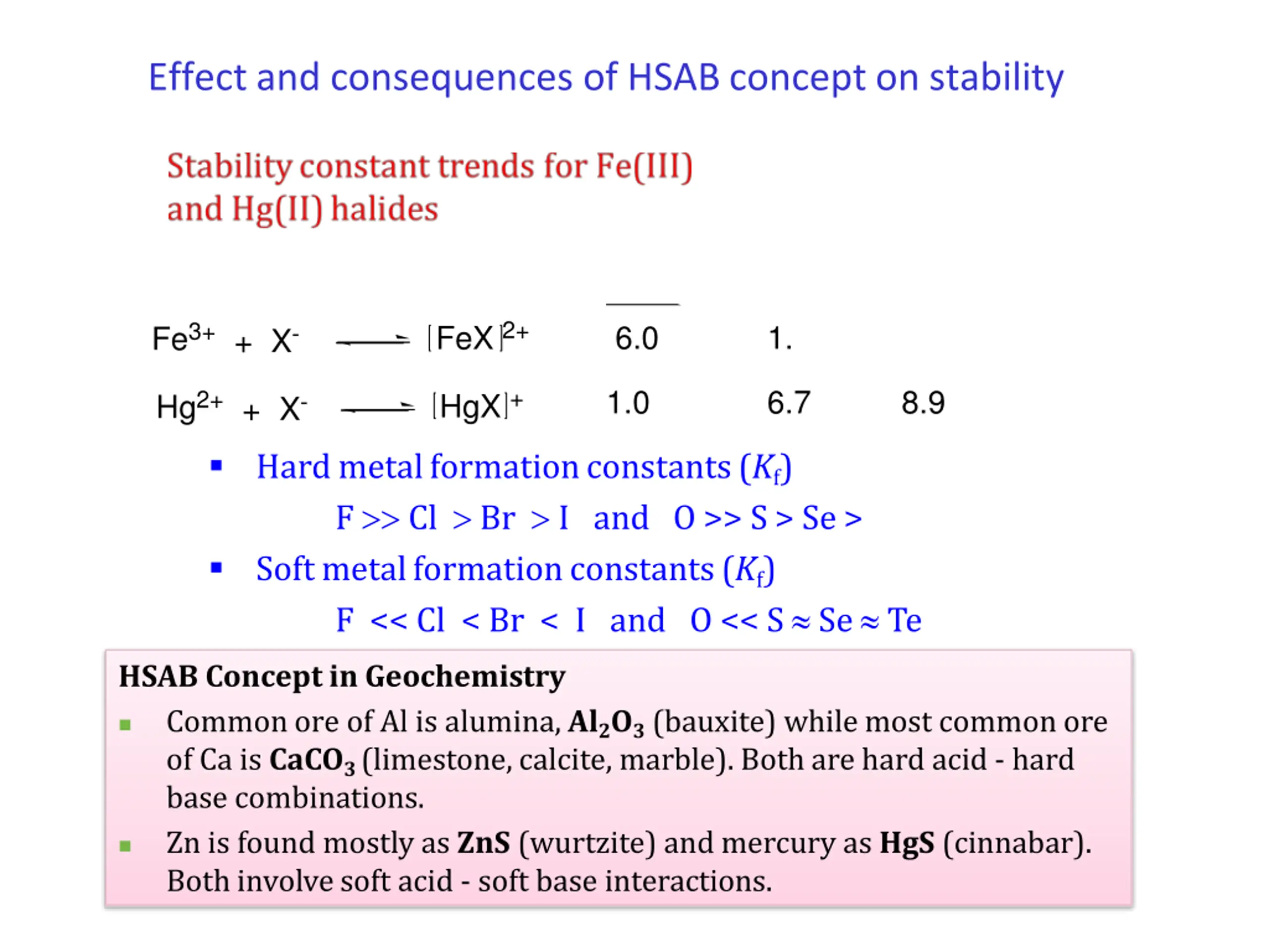 Effect and consequences of HSABconcept on stability FeX2+ Fe3+ 6.0 1. + X- 1.0 6.7 8.9 HgX+ Hg2+ + X- Hardmetalformationconstants(Kf) F Cl Br I and O >> S> Se > Softmetalformationconstants(Kf) F << Cl < Br < I and O << S Se Te HSAB Concept in Geochemistry Commonore of Al is alumina, Al2O3(bauxite) whilemost common ore of Ca is CaCO3(limestone, calcite, marble). Both are hard acid - hard base combinations. Zn is found mostly as ZnS (wurtzite) and mercury as HgS (cinnabar). Bothinvolvesoft acid - soft base interactions.