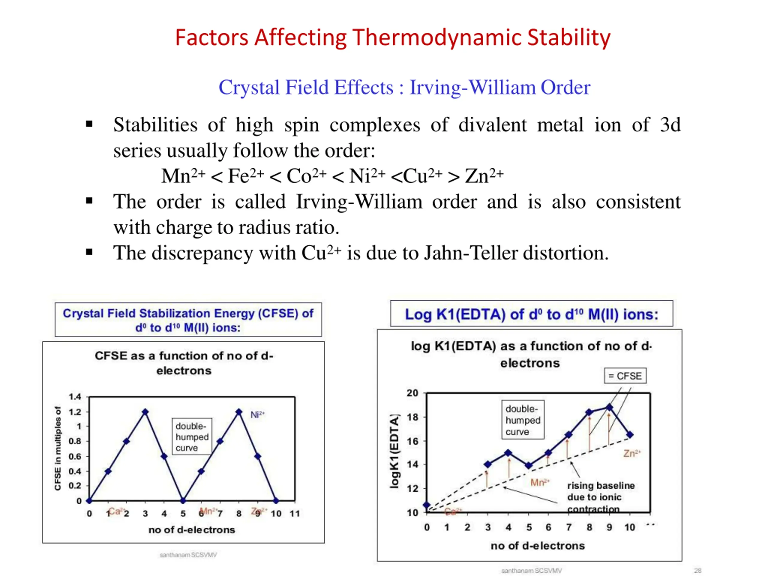 FactorsAffecting Thermodynamic Stability Crystal Field Effects : Irving-WilliamOrder Stabilities of high spin complexes of divalent metal ion of 3d series usually follow the order: Mn2+< Fe2+< Co2+< Ni2+<Cu2+> Zn2+ The order is called Irving-William order and is also consistent with charge to radius ratio. The discrepancy with Cu2+is due to Jahn-Teller distortion.