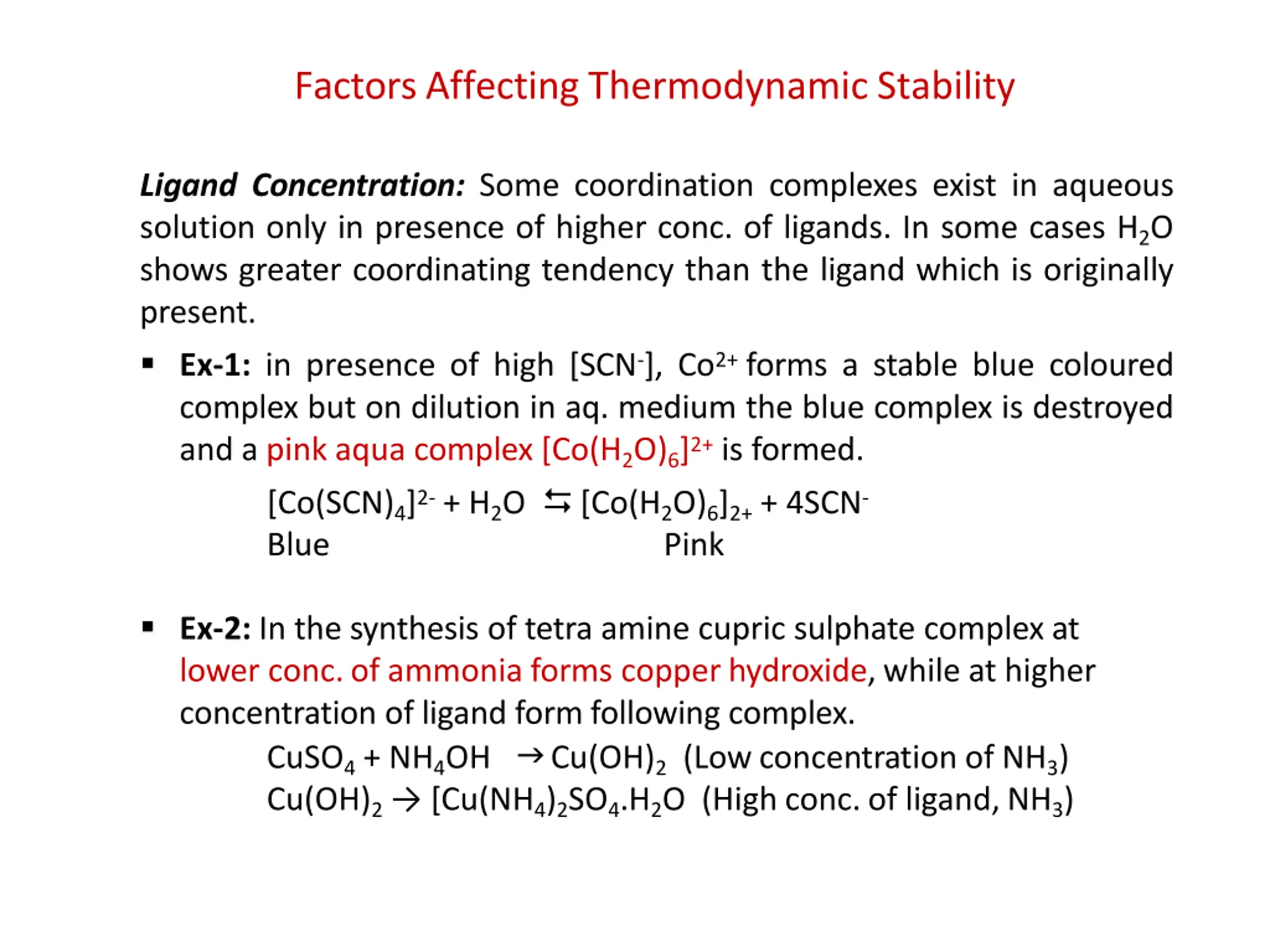 FactorsAffecting Thermodynamic Stability Ligand Concentration: Some coordination complexes exist in aqueous solution only in presence of higher conc. of ligands. In some cases H2O shows greater coordinating tendency than the ligand which is originally present. Ex-1: in presence of high [SCN-], Co2+forms a stable blue coloured complex but on dilution in aq. medium the blue complex is destroyed and a pink aqua complex [Co(H2O)6]2+is formed. [Co(SCN)4]2-+ H2O [Co(H2O)6]2++ 4SCN- Blue Pink Ex-2: In the synthesis of tetra amine cupric sulphate complex at lower conc.of ammonia forms copperhydroxide,while at higher concentration of ligand formfollowing complex. CuSO4+ NH4OH ?Cu(OH)2(Low concentration of NH3) Cu(OH)2 [Cu(NH4)2SO4.H2O (High conc.of ligand,NH3)