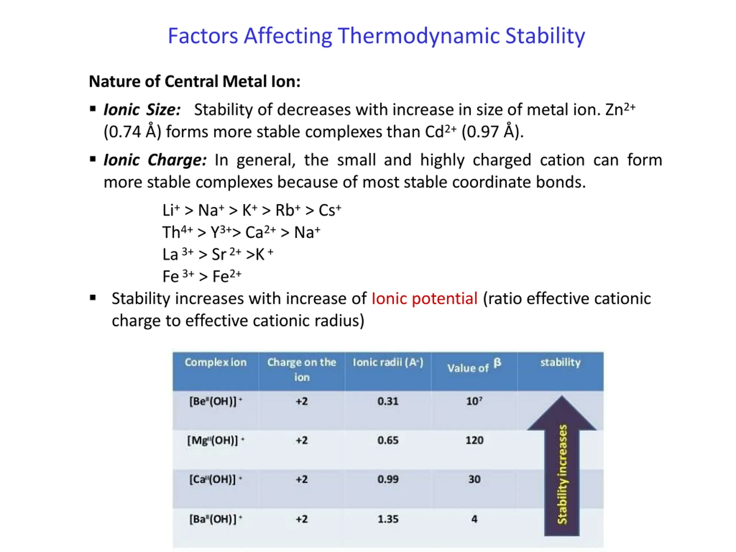 FactorsAffecting Thermodynamic Stability Nature of CentralMetalIon: Ionic Size: Stability of decreases with increase in size of metal ion. Zn2+ (0.74 ) forms more stable complexes than Cd2+(0.97 ). Ionic Charge: In general, the small and highly charged cation can form more stable complexes because of most stable coordinate bonds. Li+> Na+> K+> Rb+> Cs+ Th4+> Y3+> Ca2+> Na+ La3+ > Sr2+ >K+ Fe3+ > Fe2+ Stability increases with increase of Ionic potential (ratio effective cationic charge to effective cationic radius)