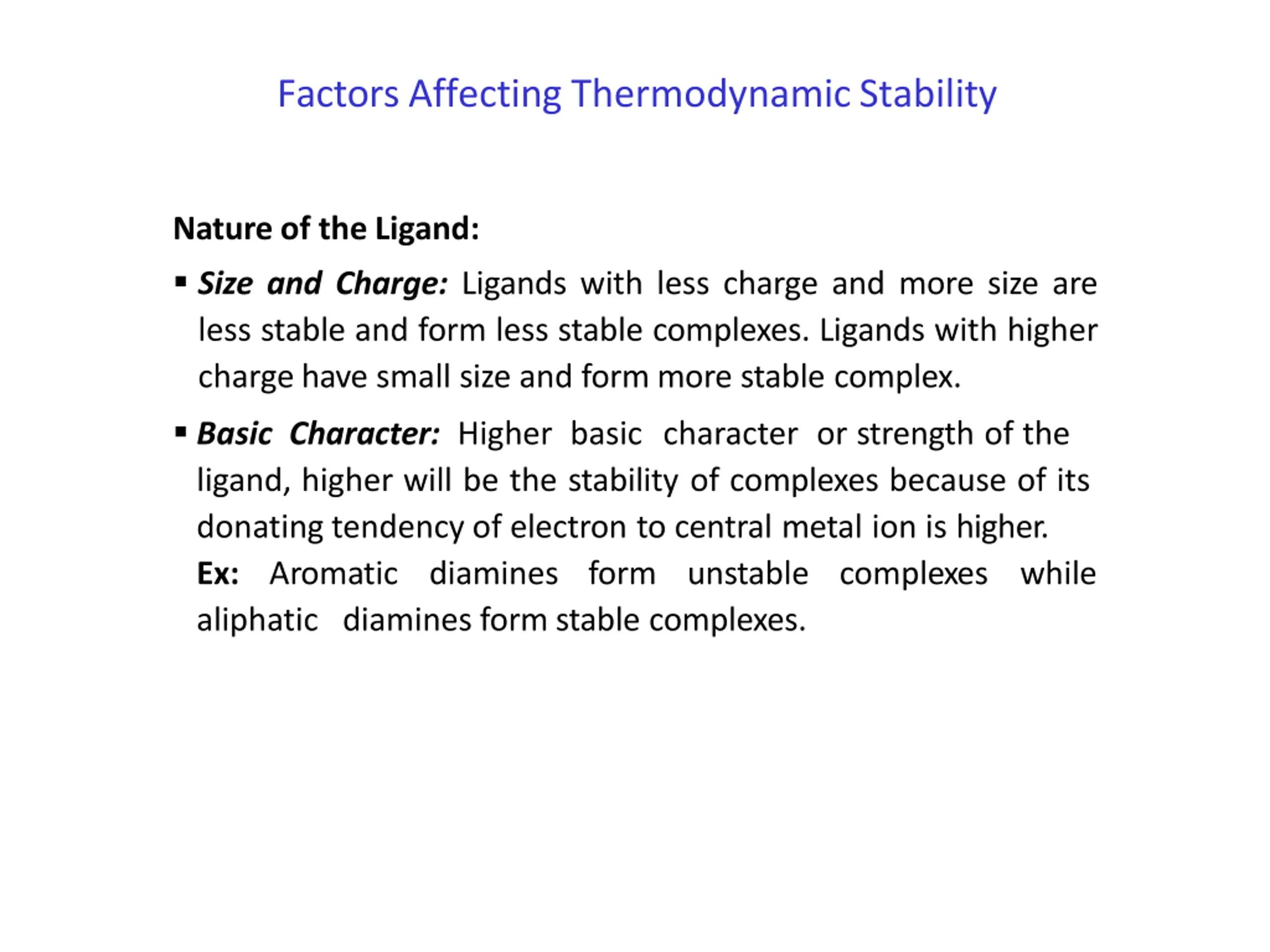 FactorsAffecting ThermodynamicStability Nature of the Ligand: Size and Charge: Ligands with less charge and more size are less stable and form less stable complexes. Ligands with higher chargehave small size and form more stable complex. Basic Character: Higher basic character or strength of the ligand, higher will be the stability of complexes because of its donating tendency of electron to central metal ion is higher. Ex: Aromatic diamines form unstable complexes while aliphatic diamines form stable complexes.