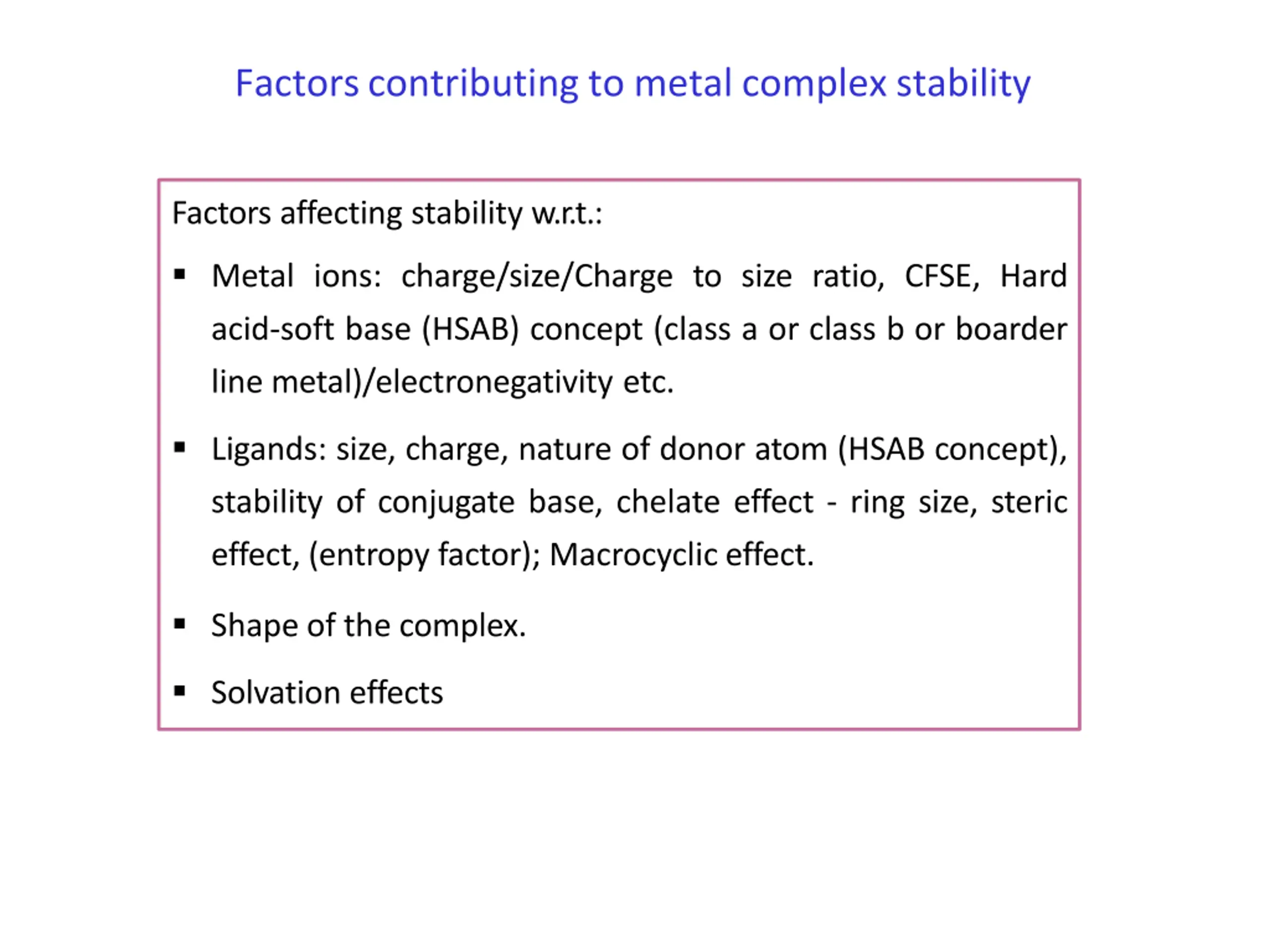 Factorscontributing to metal complex stability Factors affecting stability w.r.t.: Metal ions: charge/size/Charge to size ratio, CFSE, Hard acid-soft base (HSAB) concept (class a or class b or boarder line metal)/electronegativity etc. Ligands: size, charge, nature of donor atom (HSAB concept), stability of conjugate base, chelate effect - ring size, steric effect, (entropy factor); Macrocyclic effect. Shape of the complex. Solvation effects