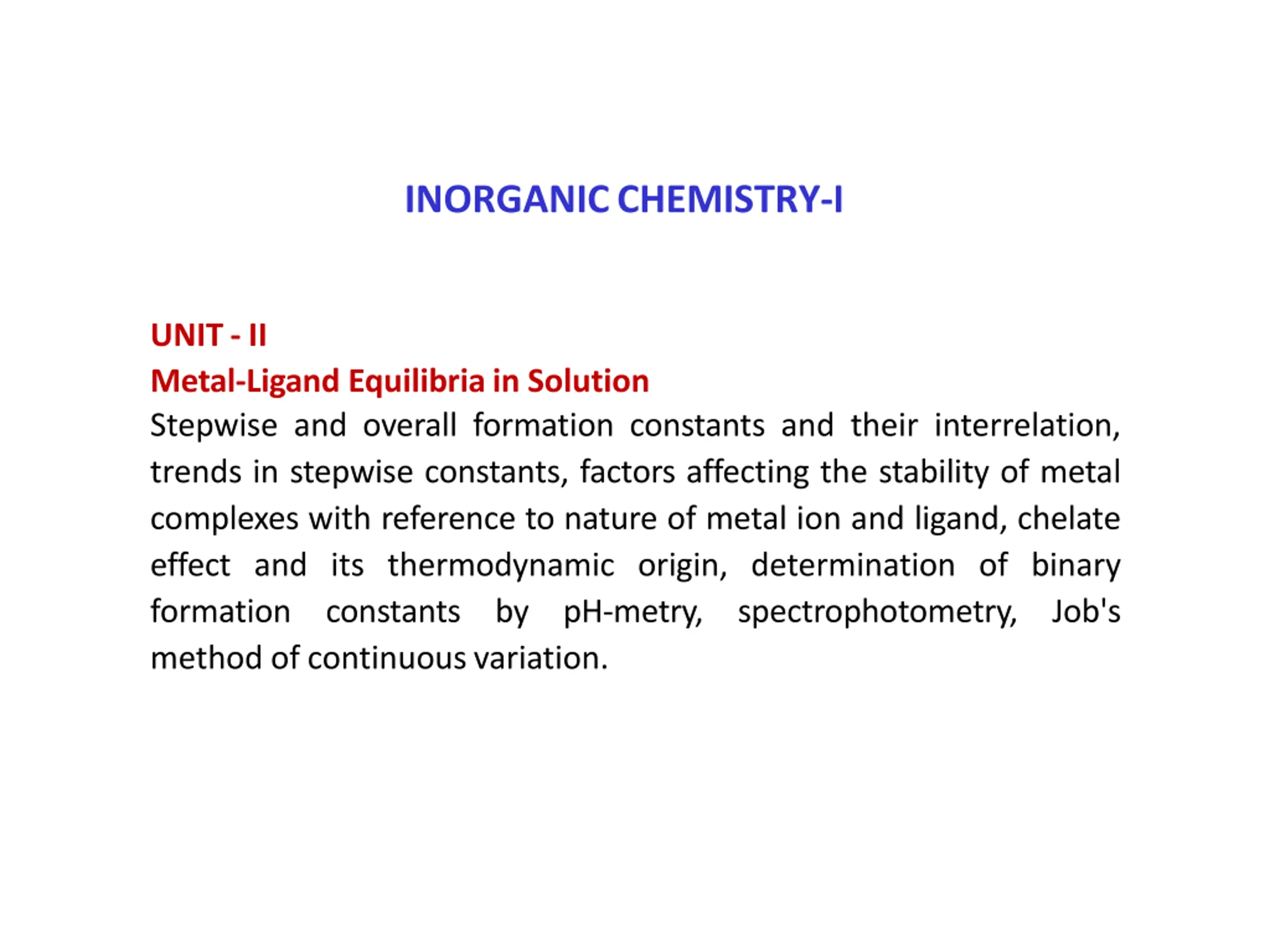 INORGANICCHEMISTRY-I UNIT- II Metal-Ligand Equilibriain Solution Stepwise and overall formation constants and their interrelation, trends in stepwise constants, factors affecting the stability of metal complexes with reference to nature of metal ion and ligand, chelate effect and its thermodynamic origin, determination of binary formation constants by pH-metry, method of continuousvariation. spectrophotometry, Job's