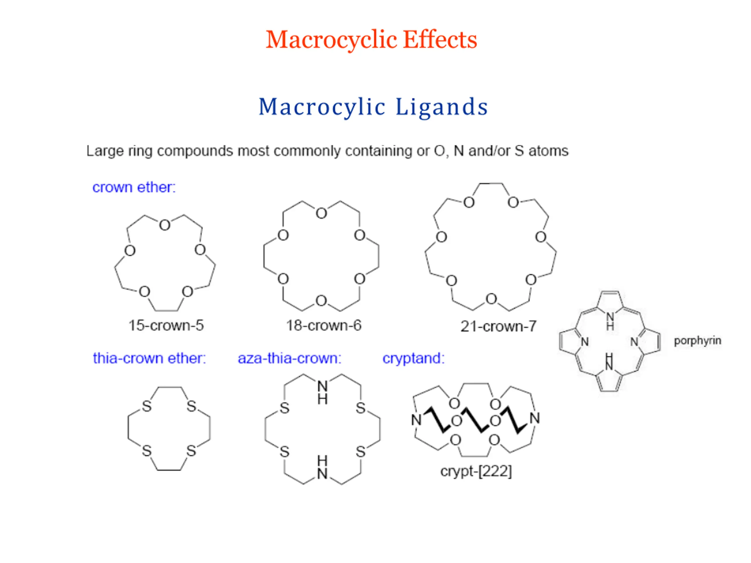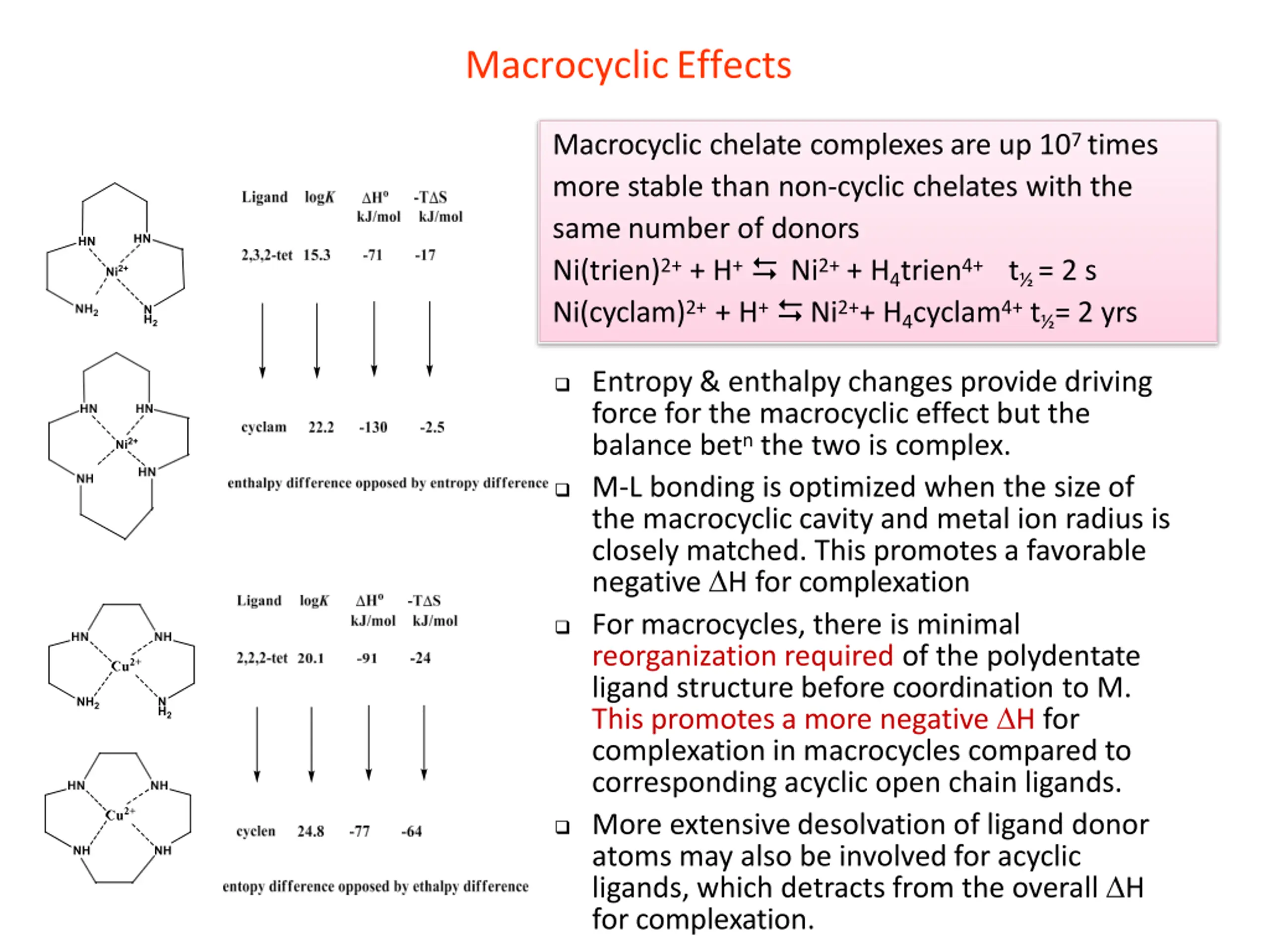 MacrocyclicEffects Macrocyclic chelate complexes are up 107times more stable than non-cyclic chelates with the same number of donors Ni(trien)2++ H+ Ni2++ H4trien4+ t = 2 s Ni(cyclam)2++ H+ Ni2++ H4cyclam4+t = 2 yrs Entropy & enthalpy changes provide driving force for the macrocyclic effect but the balance betnthe two is complex. M-L bonding is optimized when the size of the macrocyclic cavity and metal ion radius is closely matched. This promotes a favorable negative H for complexation For macrocycles, there is minimal reorganization required of the polydentate ligand structure before coordination to M. This promotes a more negative H for complexation in macrocycles compared to corresponding acyclic open chain ligands. More extensive desolvation of ligand donor atoms may also be involved for acyclic ligands, which detracts from the overall H for complexation.