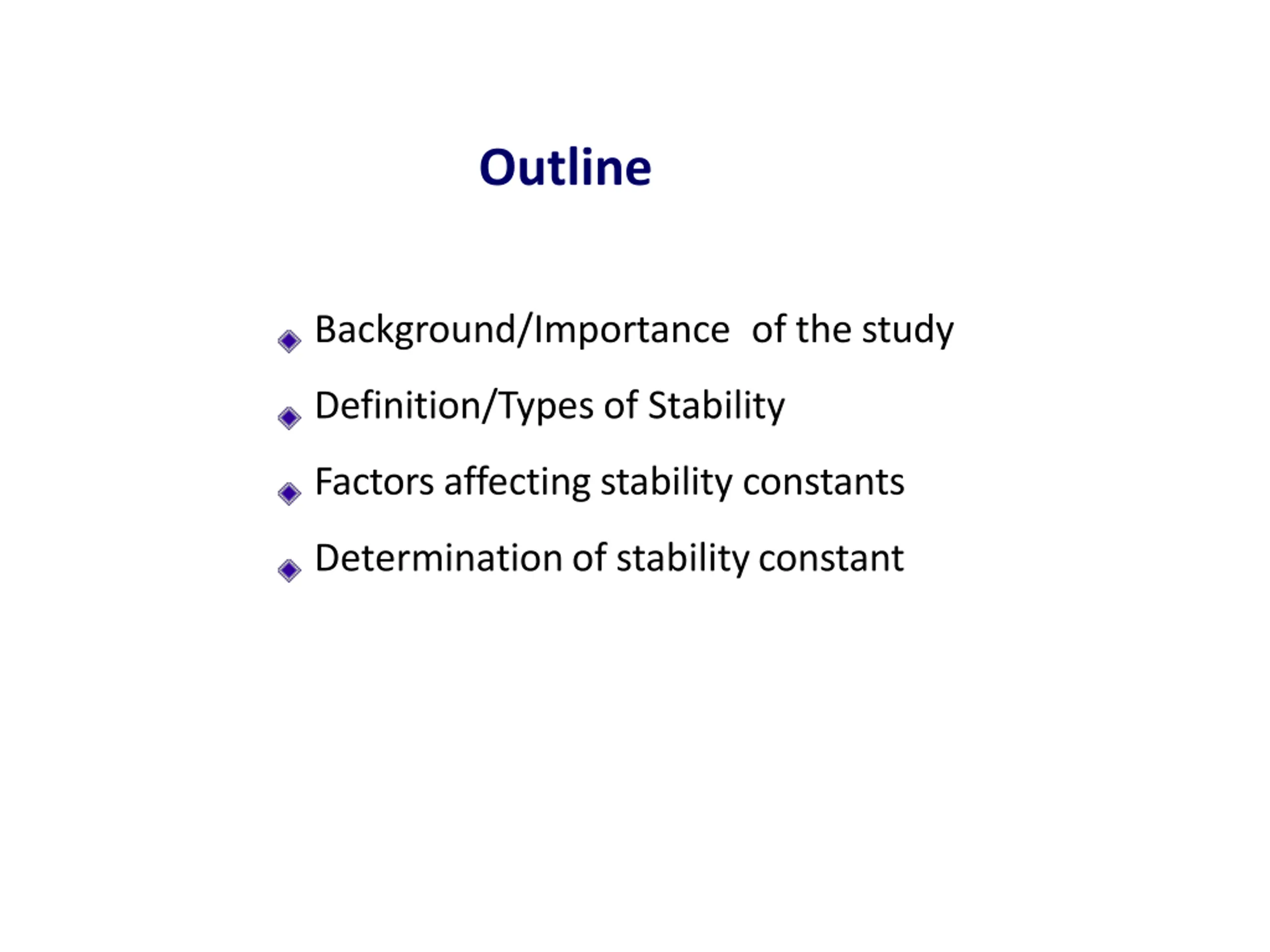 Outline Background/Importance of the study Definition/Types of Stability Factors affecting stability constants Determinationof stabilityconstant