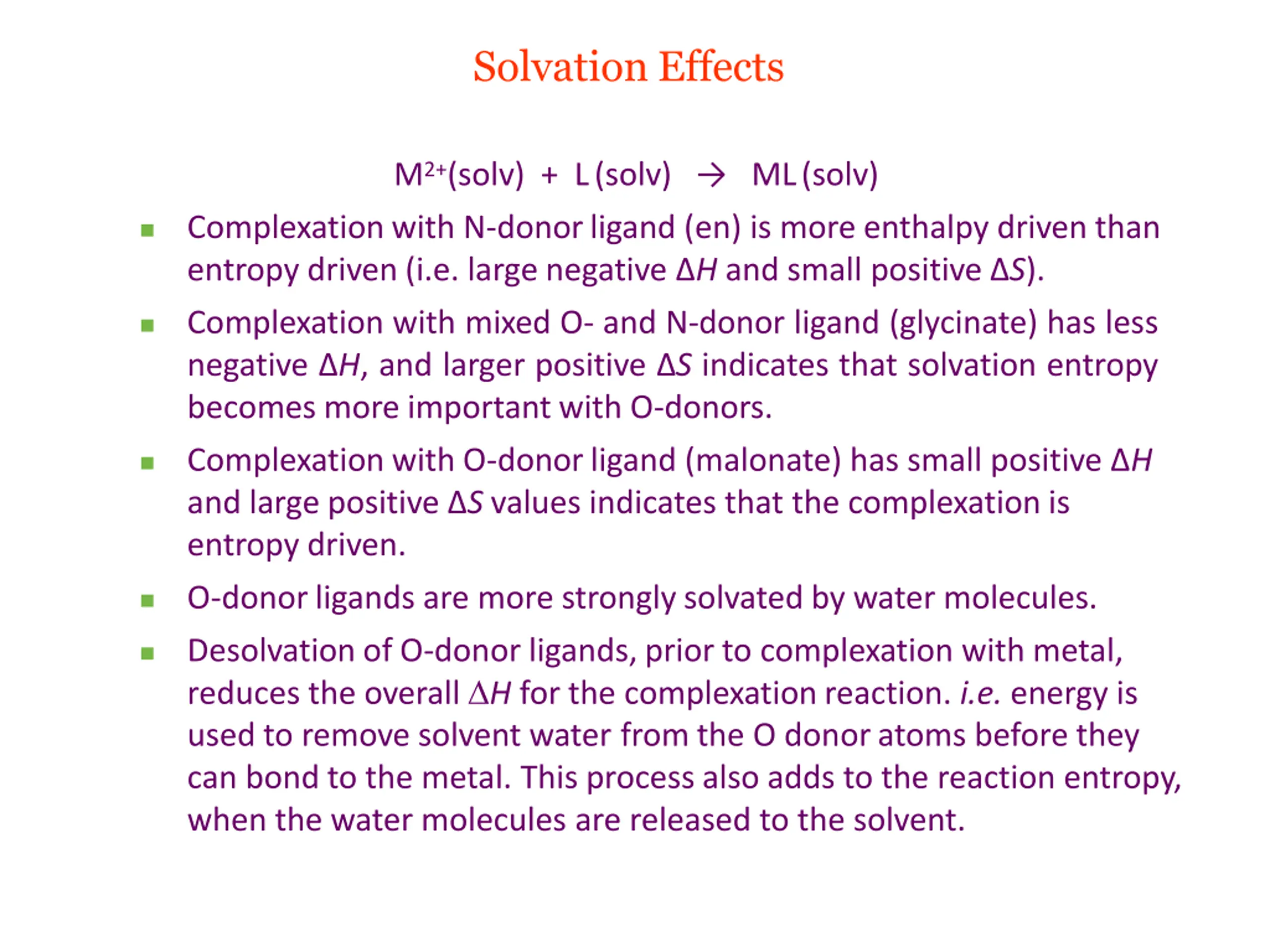 Solvation Effects M2+(solv) + L(solv) ML(solv) Complexation with N-donorligand (en) is more enthalpy driven than entropy driven (i.e. large negative H and small positive S). Complexation with mixed O- and N-donor ligand (glycinate) has less negative H, and larger positive S indicates that solvation entropy becomes more important with O-donors. Complexation with O-donorligand (malonate) has small positive H and large positive S values indicates that the complexation is entropy driven. O-donorligands are more strongly solvated by water molecules. Desolvation of O-donor ligands, prior to complexation with metal, reduces the overall H for the complexation reaction. i.e. energy is used to remove solvent water from the O donoratoms before they can bond to the metal. This process also adds to the reaction entropy, when the water molecules are released to the solvent.