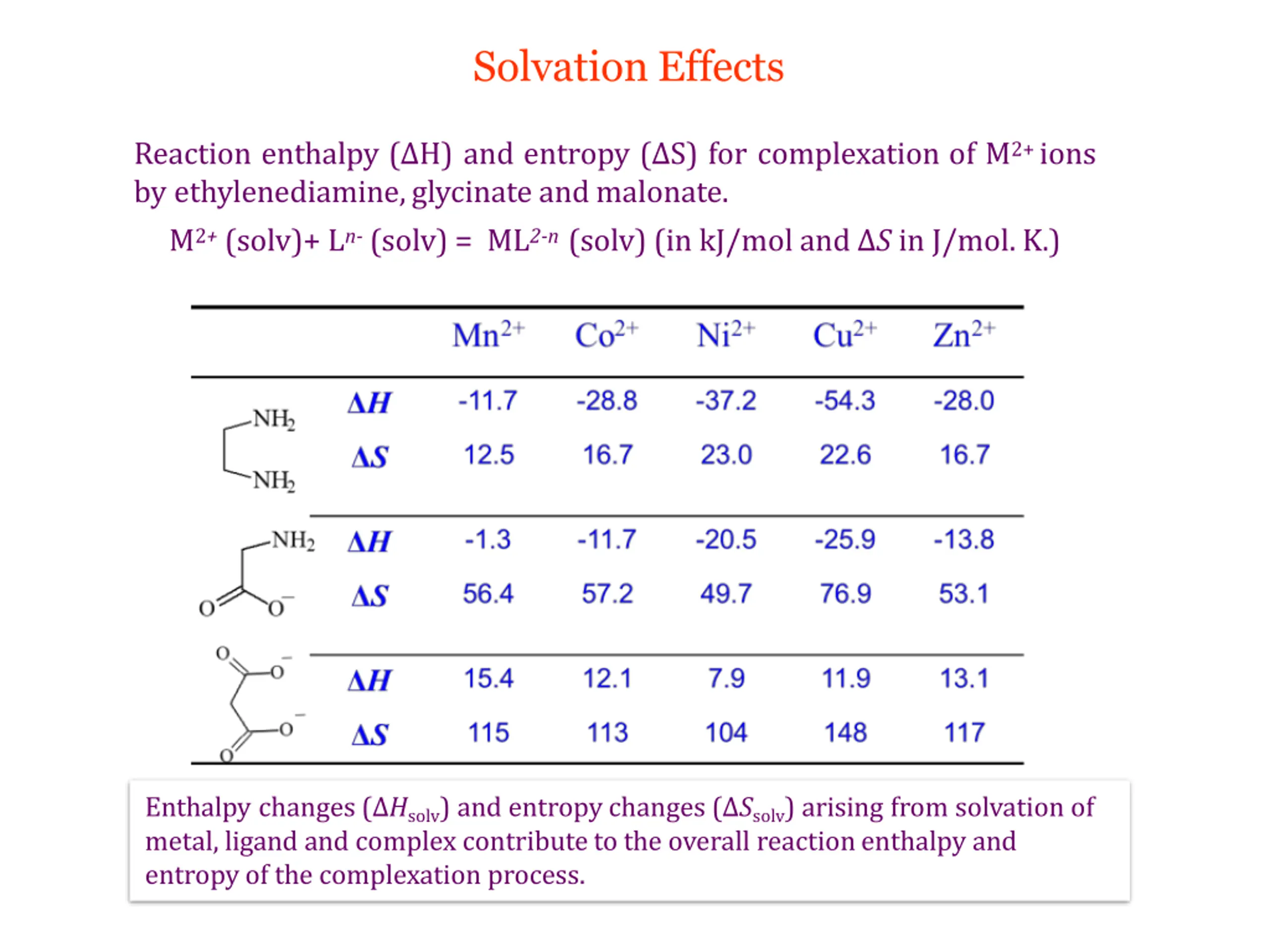 Solvation Effects Reaction enthalpy ( H) and entropy ( S) for complexation of M2+ions by ethylenediamine,glycinate andmalonate. M2+(solv)+ Ln-(solv) = ML2-n(solv) (in kJ/mol and S in J/mol. K.) Enthalpy changes ( Hsolv) and entropy changes ( Ssolv) arising from solvation of metal, ligand and complex contributeto the overall reaction enthalpy and entropyof the complexation process.