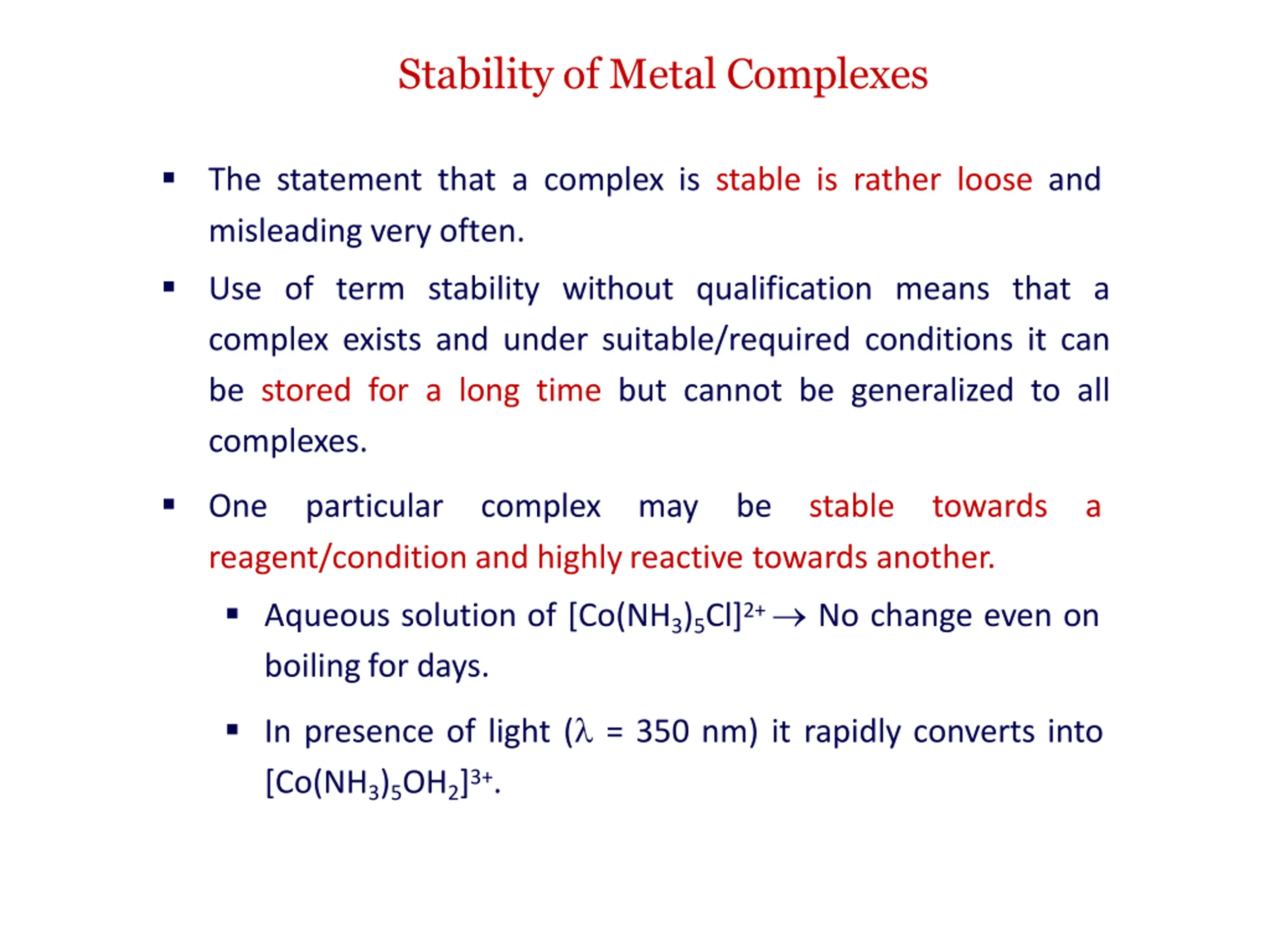 Stability of Metal Complexes The statement that a complex is stable is rather loose and misleading very often. Use of term stability without qualification means that a complex exists and under suitable/required conditions it can be stored for a long time but cannot be generalized to all complexes. One reagent/condition and highlyreactive towards another. Aqueous solution of [Co(NH3)5Cl]2+ No change even on boilingfor days. particular complex may be stable towards a In presence of light ( = 350 nm) it rapidly converts into [Co(NH3)5OH2]3+.