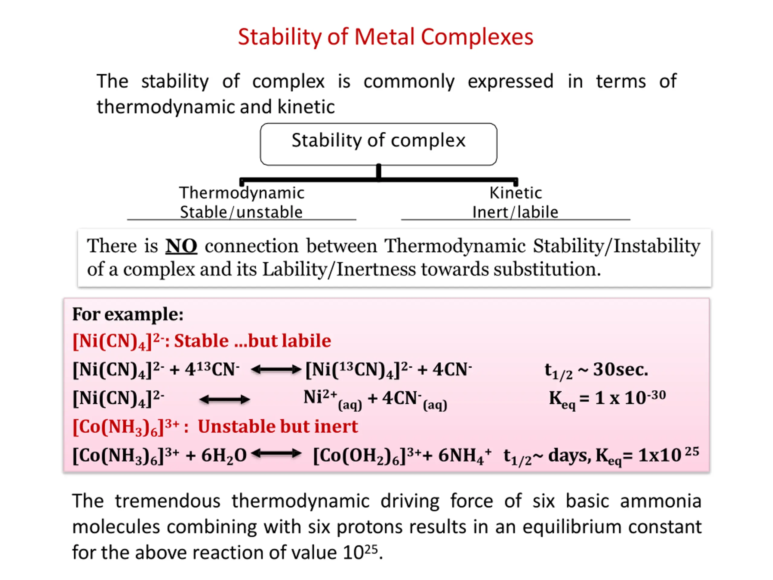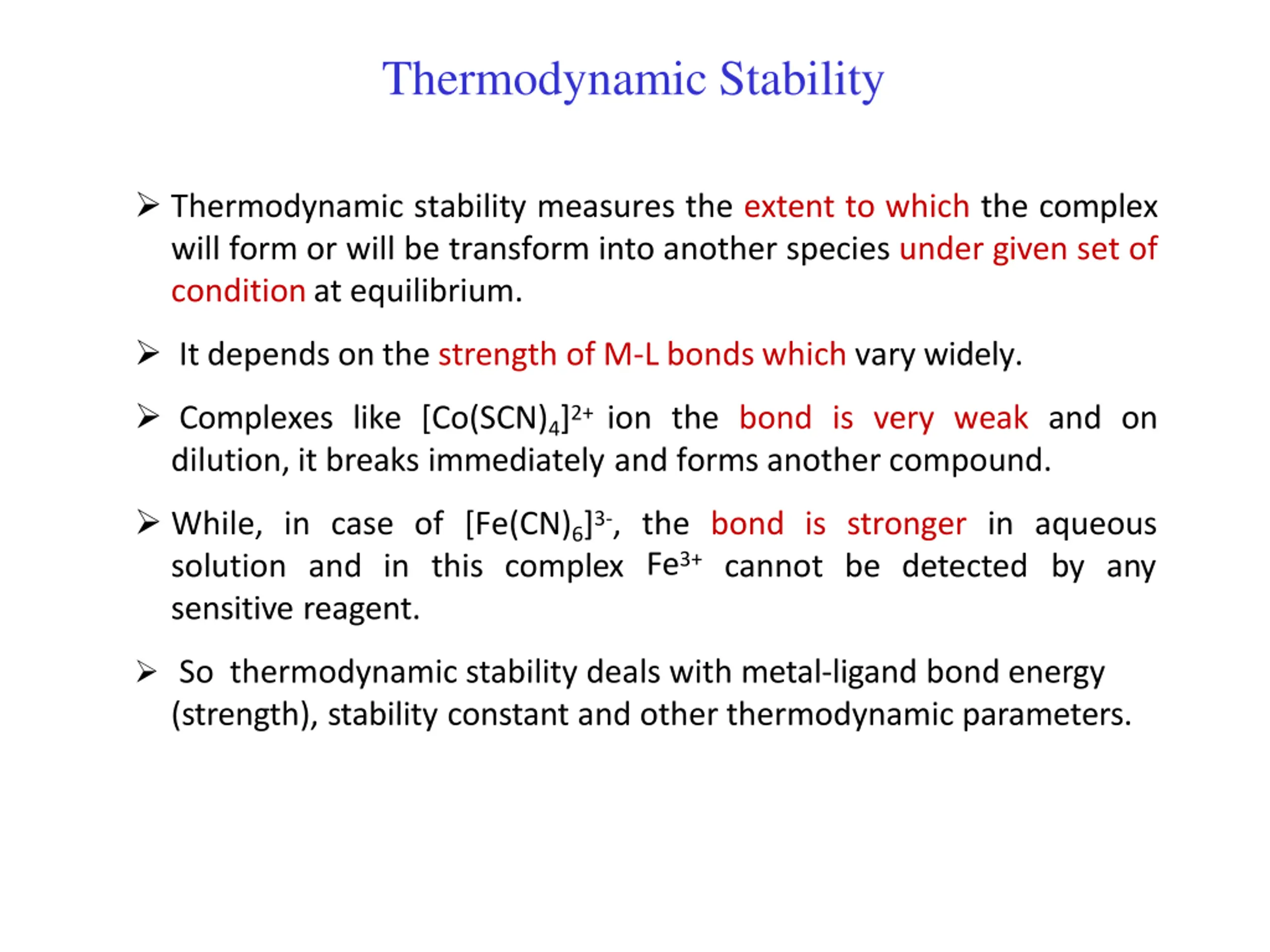 Thermodynamic Stability Thermodynamic stability measures the extent to which the complex will form or will be transform into another species under given set of conditionat equilibrium. It depends on the strength of M-L bondswhich vary widely. Complexes like [Co(SCN)4]2+ion the bond is very weak and on dilution, it breaks immediately and forms another compound. While, in case of [Fe(CN)6]3-, the bond is stronger in aqueous solution and in this complex sensitive reagent. Fe3+ cannot be detected by any So thermodynamic stability deals with metal-ligand bond energy (strength), stability constant and other thermodynamic parameters.