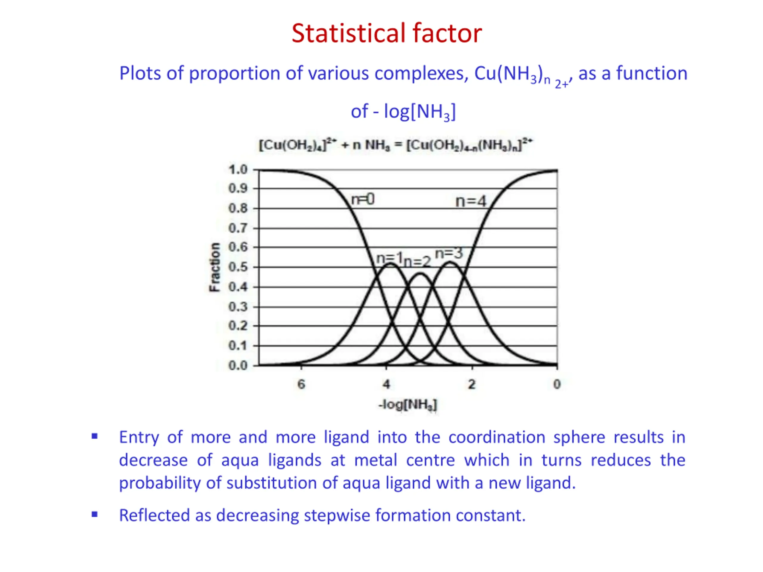 Statisticalfactor Plots of proportion of various complexes, Cu(NH3)n , as a function 2+ of - log[NH3] Entry of more and more ligand into the coordination sphere results in decrease of aqua ligands at metal centre which in turns reduces the probability of substitution of aqua ligand with a new ligand. Reflected as decreasing stepwise formation constant.