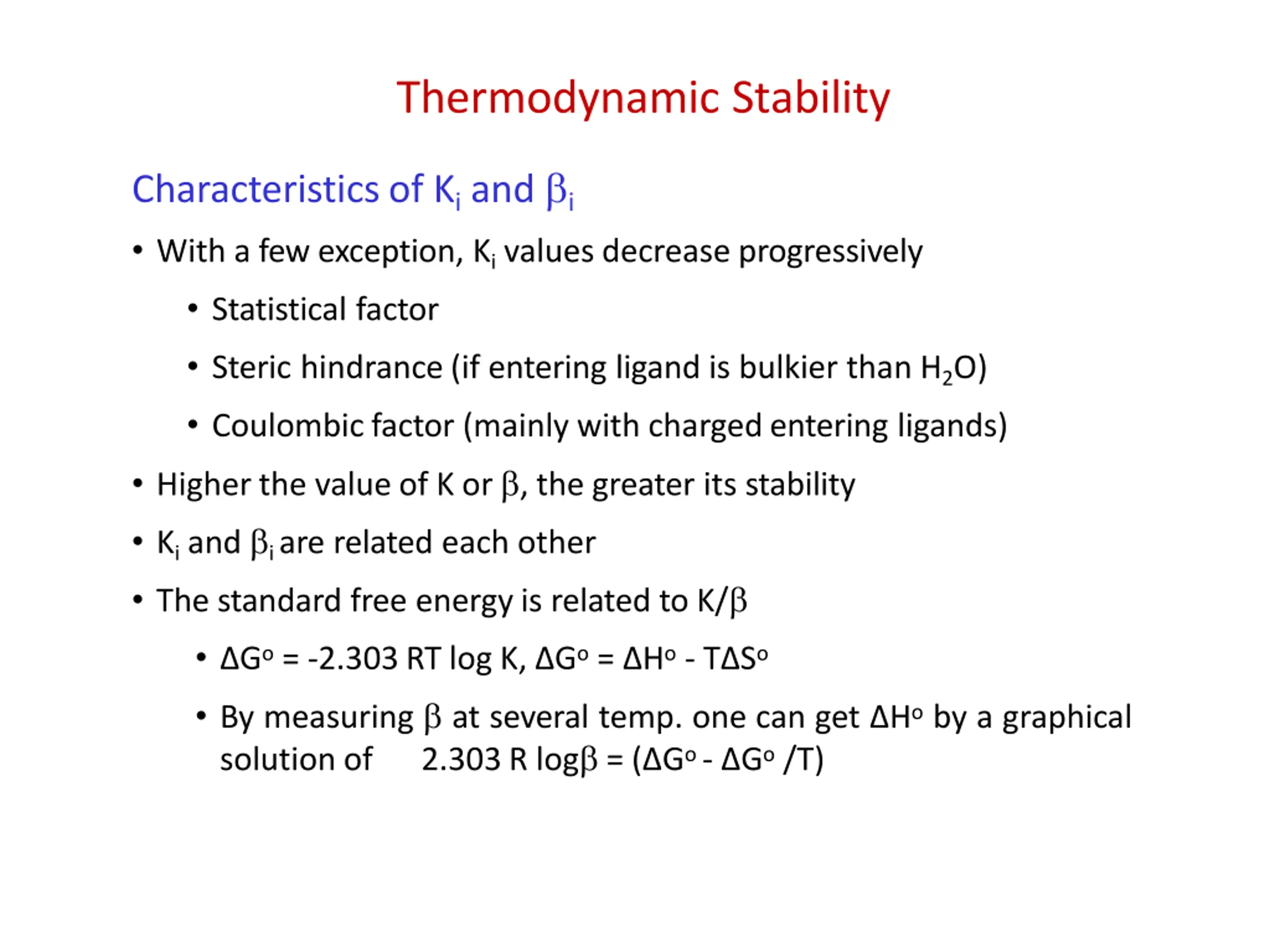 Thermodynamic Stability Characteristicsof Kiand i With a few exception, Kivalues decrease progressively Statistical factor Steric hindrance(if entering ligand is bulkier than H2O) Coulombic factor (mainly with chargedentering ligands) Higher the value of K or , the greater its stability Kiand iare related each other The standard free energyis related to K/ Go= -2.303RT log K, Go= Ho- T So By measuring at several temp. one can get Hoby a graphical solution of 2.303R log = ( Go- Go/T)
