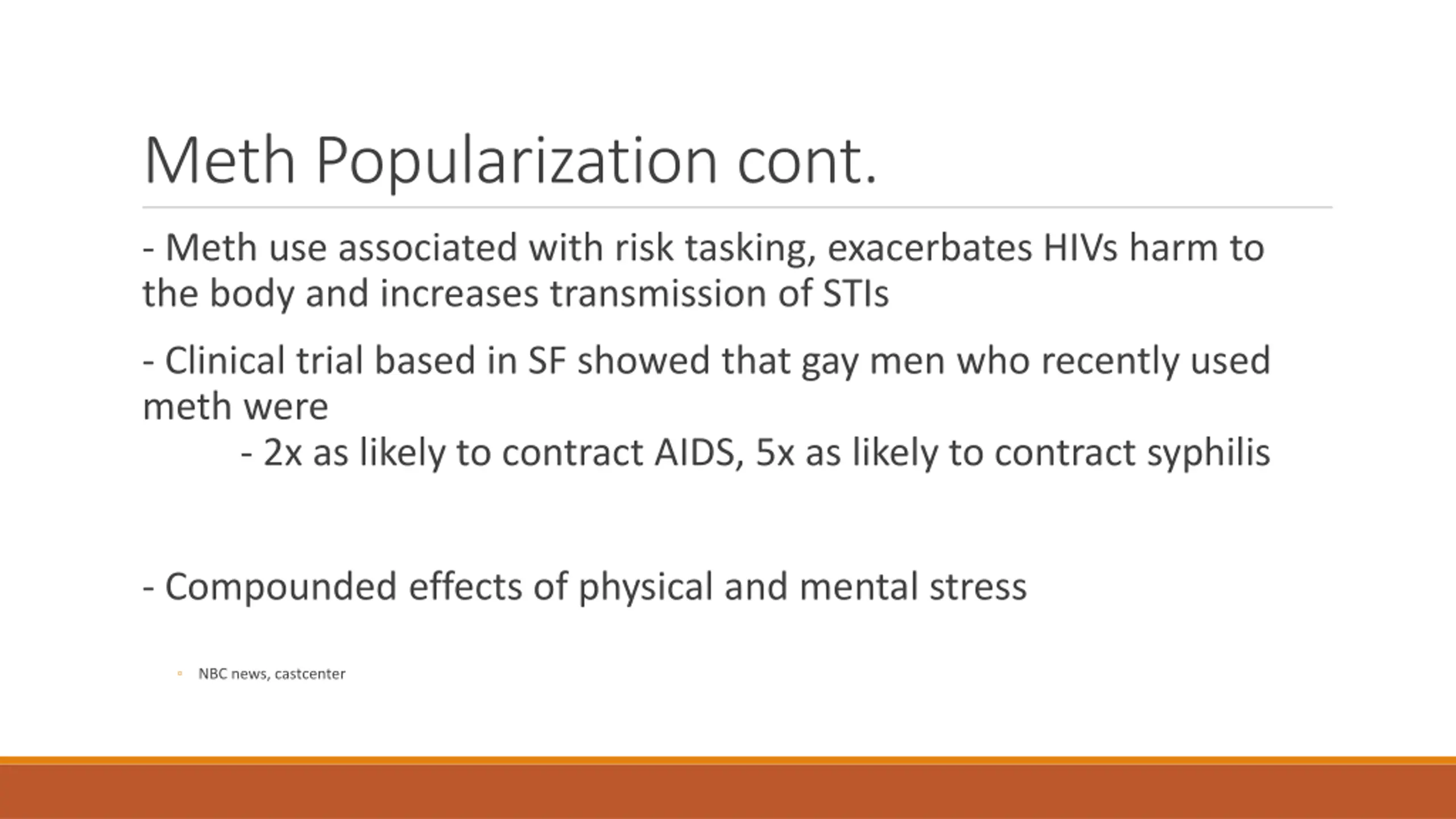 Meth Popularization cont. - Meth use associated with risk tasking, exacerbates HIVs harm to the body and increases transmission of STIs - Clinical trial based in SF showed that gay men who recently used meth were - 2x as likely to contract AIDS, 5x as likely to contract syphilis - Compounded effects of physical and mental stress NBC news, castcenter